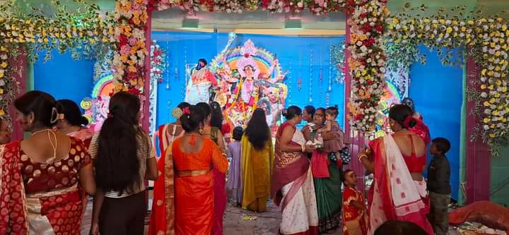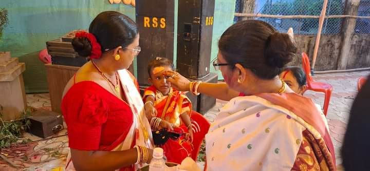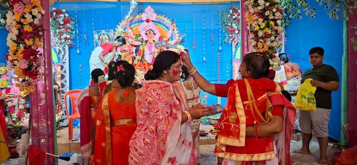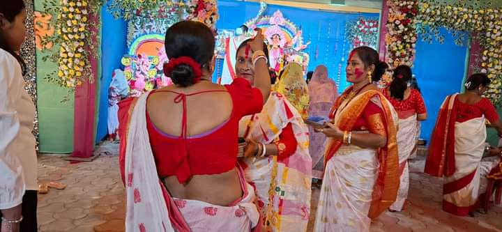 झापा (भद्रपुर): विजयादशमीको अबसरमा भद्रपुरमा बंगाली समुदायका महिलाहरूले माता दुर्गालाई सिन्दुर लगाएर विदाई गर्दै। साथै एकआपसमा सिन्दुर लगाएर खुशी साटासाट गर्दै: