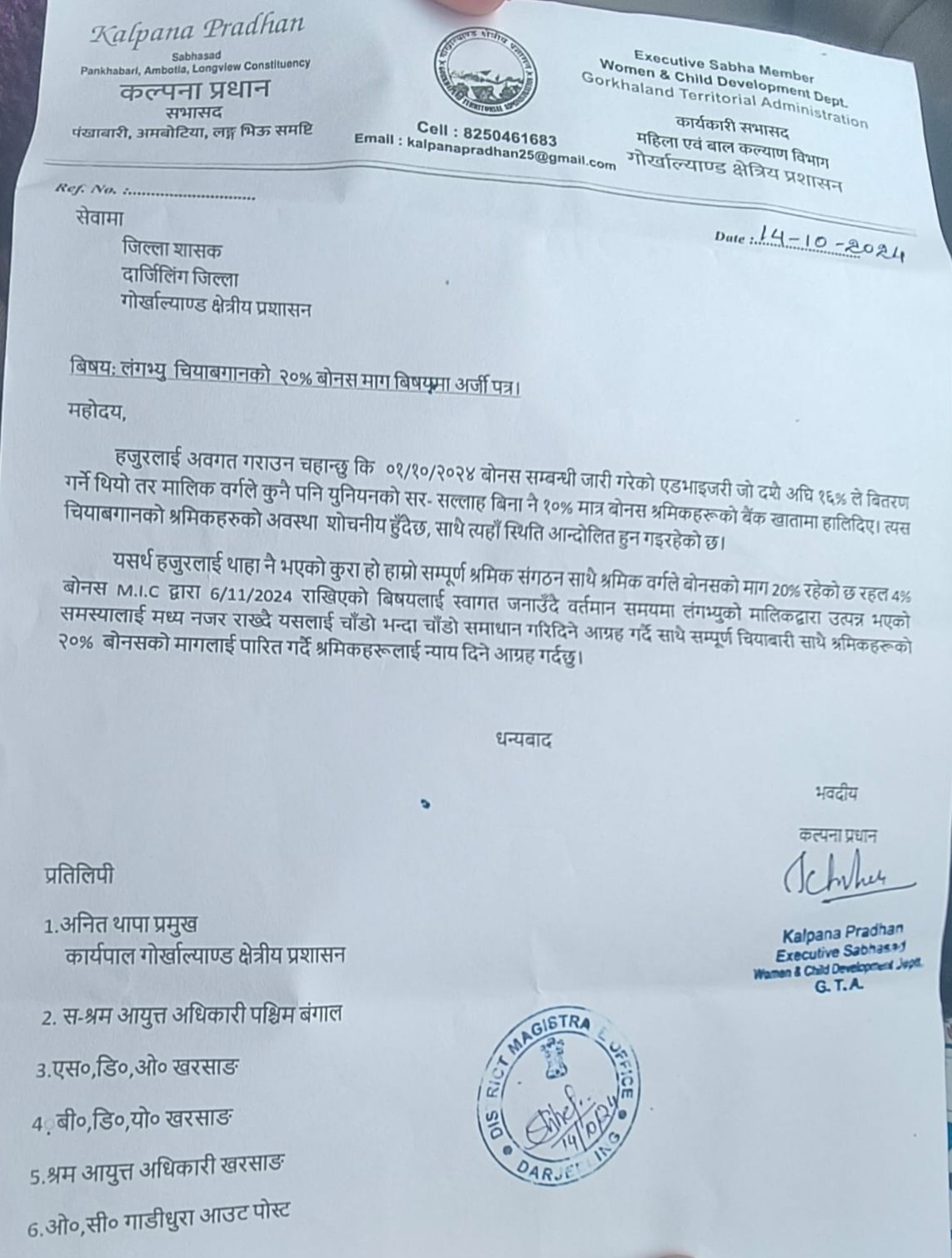उक्त टोलीले अर्जी पत्रमा चिया बगानको स्थितिलाई अवगत गराउँदै भनेका छन् कि १ अक्टोबर २०२४ मा बोनस सम्बन्धी जारी गरेको एडभाइजरी जो दशैं अघि १६ प्रतिशतले वितरण गर्नु पर्ने थियो तर मालिकवर्गले कुनै पनि युनियनको सर-सल्लाहबिना नै केवल १० प्रतिशत मात्र बोनस श्रमिकहरूको बैंक खातामा हालिदिएको छ। लङ्भ्यु चियाबगानको श्रमिकहरुको अवस्था शोचनीय हुँदैछ साथै त्यहाँ स्थिति आन्दोलित हुन गइरहेको छ। पत्रमा श्रमिकको मांग विषयमा ध्यान आकर्षण गर्दै भनिएको छ कि सम्पूर्ण श्रमिक संगठन साथै श्रमिकवर्गले बोनसको माग बीस प्रतिशत रहेको छ। वर्तमान समयमा लङभ्यु बगानको मालिकद्वारा उत्पन्न भएको समस्यालाई मध्य नजर राख्दै यसलाई चाँडोभन्दा चाँडो समाधान गरिदिने आग्रह गरिएको छ। यसको साथै सम्पूर्ण चियाबारी साथै श्रमिकहरूलाई न्याय दिने आग्रह गरिएको छ।