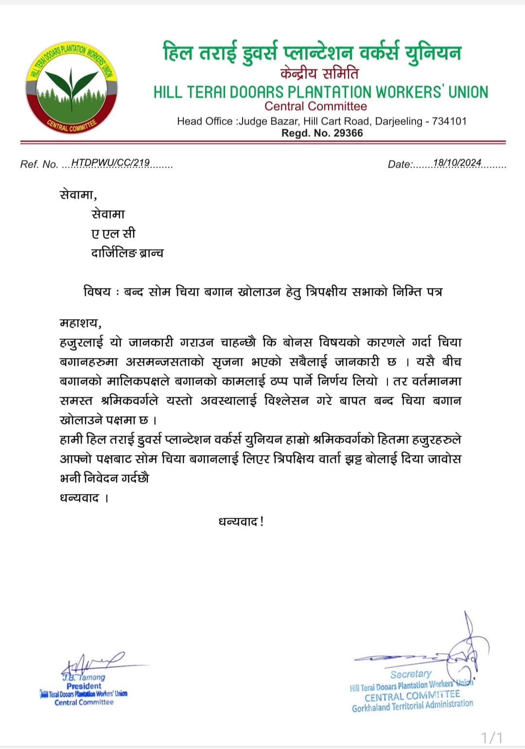 त्यही सभामा लिइएको निर्णय अनुसार भारतीय गोर्खा प्रजातान्त्रिक मोर्चाका ट्रेड युनियन हिल तराई डुवर्स प्लान्टेशन वर्कर्स युनियनले दार्जीलिङ शाखाका एएलसी-लाई वर्तमान कमानको स्थिति अनि श्रमिकहरुको आग्रहलाई केन्द्र गर्दै त्रिपक्षीय बैठक बोलाउने आग्रहकाे साथ पत्राचार गरेका छन्। श्रमिकहरु चिया बगान खोल्ने पक्षमा रहेको पत्रमा जनाइएको छ। त्यसरी नै ट्रेड युनियनले संगठनको गतिविधिलाई निरन्तरता दिनु सोम चिया बगानको तीनवटै विभागको निम्ति कृष्ण शर्मालाई संगठनको संयोजक पदमा नियुक्त गरेको छ।
