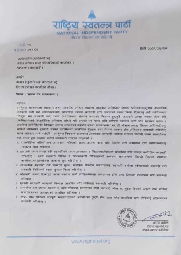 बिराटनगर: राष्ट्रिय स्वतन्त्र पार्टी मोरङले सहकारी बाट रकम अपचलनमा संलग्न नभएको किटान हुदाहुँदै राष्ट्रिय स्वतन्त्र पार्टी मोरंगका सह संयोजक भरत कड़ेल नेतृत्वको टोलीले आफना नेता रवि लामिछानेलाई राजीतिक प्रतिशोधका आधारमा गरिएको धर पकड प्रति आपत्ति जनाउदै जिल्ला प्रशासन कार्यलय मोरङ मार्फत प्रधानमन्त्री केपी शर्मा ओलीलाई ७ बुदे ज्ञापन पत्र बुझाएको छ।
