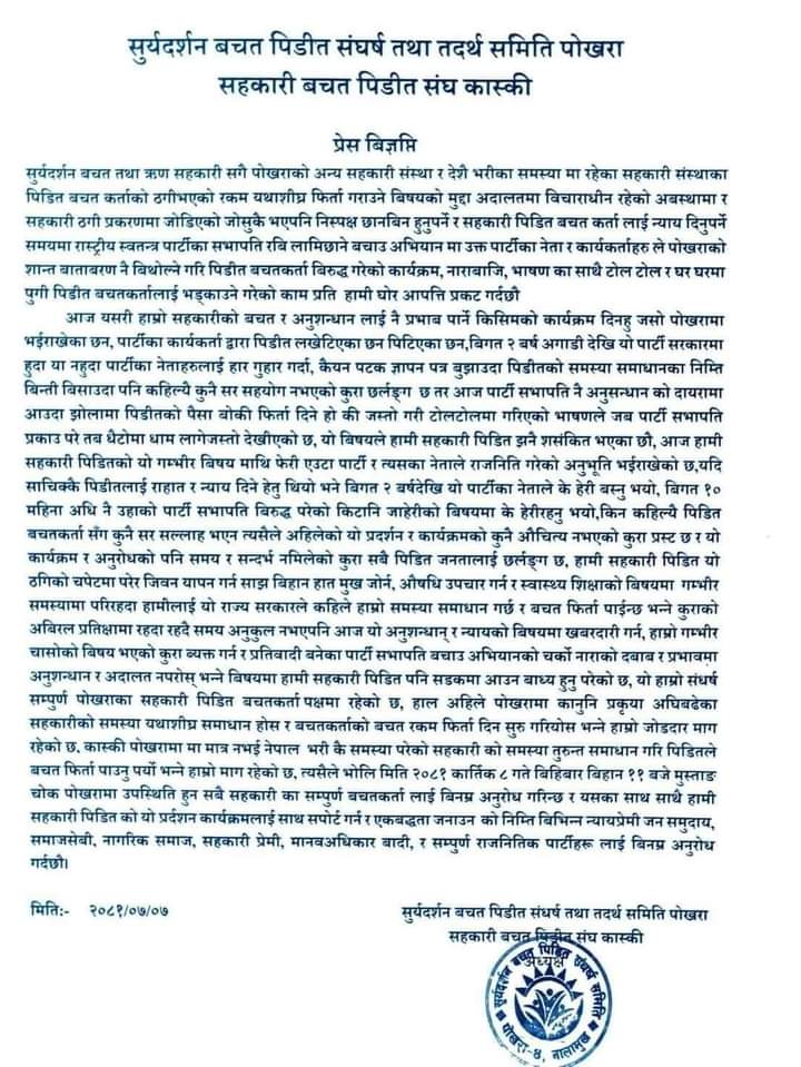 सूर्यदर्शन बचत पीडित संघर्ष तथा तदर्थ समिति पोखराले एक विज्ञप्ति जारी गर्दै रास्वपाका नेता र कार्यकर्ताहरुले घरघरमा पुगेर पीडित बचतकर्तालाई भड्काउने काम गरेको आरोप लगाएको छ।