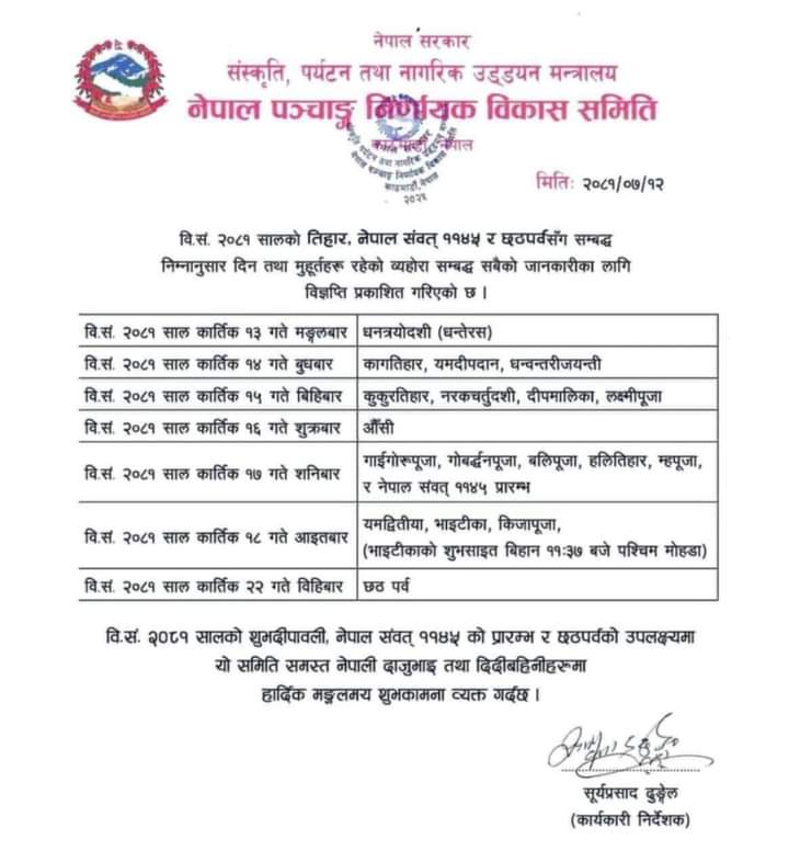 भद्रपुर: कार्तिक कृष्ण त्रयोदशीदेखि लाग्ने यमपञ्चक मंगलबार नै शुरु हुँदैछ। नेपाल पञ्चाङ्ग निर्णायक समितिका अनुसार बिहान ११ बजेर १ मिनेटसम्म द्वादशी तिथि रही त्यसपछि त्रयोदशी लाग्ने भएकाले यमपञ्चक मंगलबार नै शुरु हुन लागेको हो।
