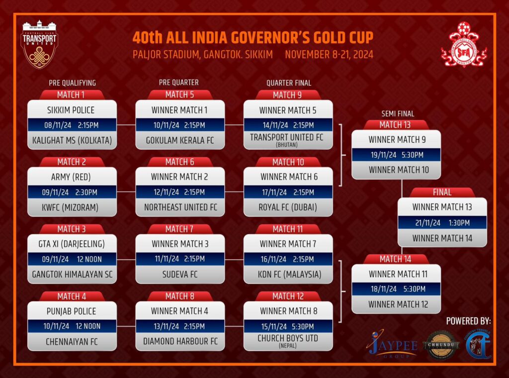 गान्तोक: प्रतिष्ठित गवर्नर्स गोल्ड कप फूटबल टुर्नामेण्टको ४०औं संस्करण ८ नोभेम्बरदेखि गान्तोक (सिक्किम)-को पाल्जोर स्टेडियममा शुरु हुनेछ। चार सालको ब्रेकपछि गवर्नर्स गोल्ड कपको ४०औं संस्करण भव्यताको साथ सम्पन्न गर्न आयोजक सिक्किम फूटबल एसोसिएशन (एसएफए) तयार रहेको छ। टुर्नामेण्टको आउँदो संस्करणमा जम्मा १६ वटा अग्रणी टीमहरूले हिस्सा लिनेछ। यसमा चारवटा विदेशी टीम- ट्रान्सपोर्ट युनाइटेड फूटबल क्लब (भूटान), रोयल फूटबल क्लब (यूएई), केडीएन एफसी (मलेशिया) र चर्च बोयज युनाइटेड (नेपाल) सामेल छन्। यसको साथमा सिक्किम पुलिस एफटी, कालीघाट एमएस, आर्मी (रेड), खावज्वाल भेंगथार एफसी (मिजोरम), जीटीए इलेभेन (दार्जीलिङ), गान्तोक हिमालयन फूटबल क्लब (सिक्किम),पञ्जाब पुलिस एफटी, चेन्नईयन एफसी (आर), गोकुलम केरला एफसी, नर्थईष्ट युनाइटेड एफसी (आर), सुदेवा एफसी (दिल्ली) र डायमण्ड हार्बर एफसी-को टीम सामेल छन्।