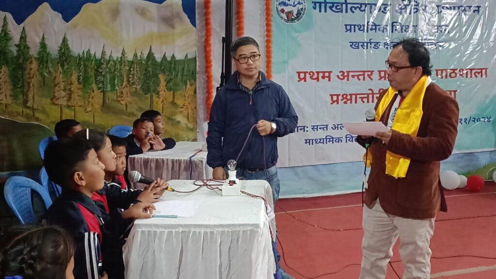 खरसाङ: गोर्खाल्याण्ड क्षेत्रीय प्रशासनको प्राथमिक शिक्षा विभाग अन्तर्गत खरसाङ क्षेत्रको आयोजनामा आज खरसाङमा प्रथम अन्तर प्राथमिक पाठशाला स्तरीय प्रश्नोत्तरी (हाजिरी जवाब) प्रतियोगिता सम्पन्न भएको छ। प्राथमिक पाठशालाहरूका नानीहरूलाई पुस्तकीय ज्ञानबाहेक विभिन्न ज्ञानहरू दिनलाई साथै विभिन्न प्रतियोगितामूलक कार्यक्रमहरूमा सक्रिय रूपमा अघि बढाउन उक्त प्रकारका कार्यक्रमहरू आयोजना गरिएको छ। खरसाङको सन्त अल्फन्सेस विद्यालयमा आयोजित उक्त प्रतियोगितामा खरसाङ क्षेत्रका जम्मा ३० वटा प्राथमिक पाठशालाहरूले सहभागिता जनाएका थिए जसमा पहिलो चरणमा प्रतियोगिता गराएर फाईनल राउण्डमा छवटा प्राथमिक पाठशालाहरू चयन गरिएको थियो। उक्त प्राथमिक पाठशाला स्तरीय प्रश्नोत्तरी प्रतियोगितामा क्लिज मास्टरको रूपमा शिक्षकद्वय मोहन रूम्बा र निमेश राई रहेका थिए। दुवैले प्रतियोगितालाई सञ्चालन गरेका थिए। त्यसरी नै कार्यक्रमलाई शिक्षिका पासाङ लक्की शेर्पाले सञ्चालन गरेका थिए। यस कार्यक्रममा प्रमुख अतिथिको रुपमा खरसाङ नगरपालिकाको चेयरम्यान ब्रिगेन गुरुङ उपस्थित रहेका थिए भने विशिष्ट अतिथिको रुपमा खरसाङ नगरपालिकाको भाइस चेयरम्यान सुवास, सभासद श्याम शेर्पा, खरसाङ खण्ड पञ्चायत समितिको कर्माध्यक्ष वाङ्दी लामा, घैयाबारी ग्राम पञ्चायत तीनको पञ्चायत प्रधान सुष्मा वाईबा, सिटोङ दुई ग्राम पञ्चायतको प्रधान समीर कार्की, एसआई अविनाश शर्मा र एआई सृष्टि गोम्देन लगायत अन्यहरू उपस्थित रहेका थिए। उक्त प्रतियोगिताको फाइनल राउण्डमा प्रथम अप्पर मामरिङ प्राथमिक पाठशाला, दोस्रो नेताजी प्राथमिक पाठशाला घैयाबारी र तेस्रो सन्त अल्फन्सेस प्राथमिक पाठशाला भएका छन्। त्यसरी नै यस प्रतियोगितामा दुधे प्राथमिक पाठशाला, स्कट मिशन प्राथमिक पाठशाला र ज्योत्सनामयी जुनियर बेसिक प्राथमिक पाठशाला आदिले पनि फाईनलमा स्थान बनाएका थिए।