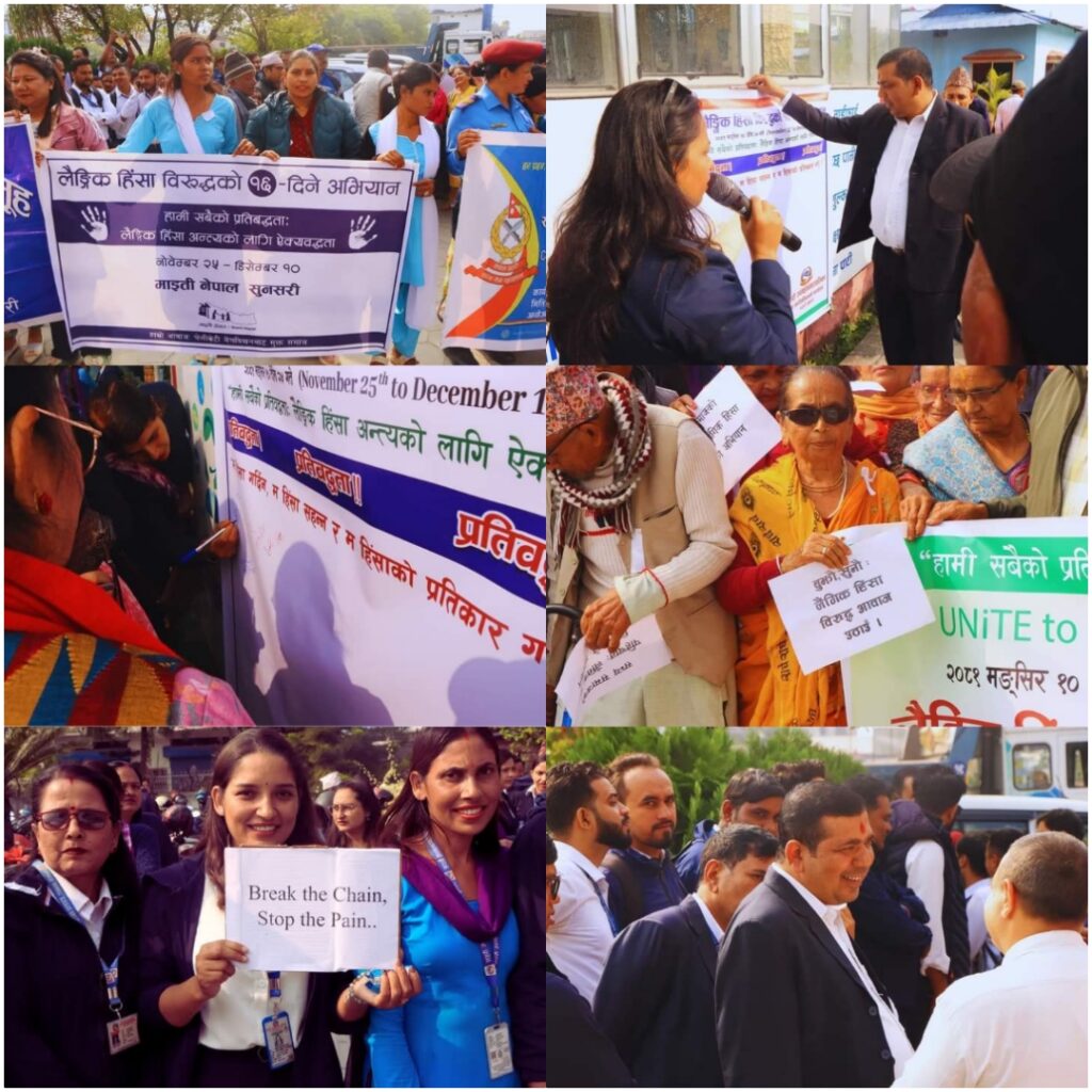 इटहरी :सुनसरीको इटहरी उपमहानगरपालिकाको आयोजनामा लैङ्गिक हिंसा विरुद्धको १६ दिने अभियानको सुरुको दिन सोमबार प्रभात फेरीमा सहभागीहरू। ‘हामी सबैको प्रतिबद्धता : लैङ्गिक हिंसा अन्त्यको लागि ऐक्यबद्धता’ भन्ने नाराका साथ सुरु अभियान दिसंबर १०सम्म सञ्चालन हुने छ।