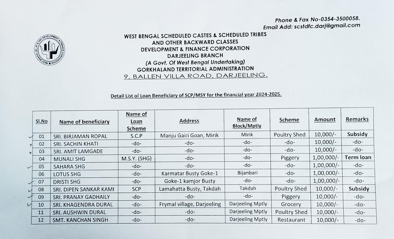 दार्जिलिङ: पश्चिम बंगाल अनुसूचित जाति र अनुसूचित जनजाति र अन्य पछौटेवर्ग विकास र वित्त निगम दार्जिलिङ शाखा, गोर्खाल्याण्ड क्षेत्रीय प्रशासनले आज दार्जिलिङको गोर्खा रङ्गमञ्च भवनमा एउटा कार्यक्रम आयोजना गरेर वित्तीय वर्ष २०२४-२०२५ को लागि एससीपी/एमएसवाईको ऋण लाभार्थीहरुलाई वितरण गरेको छ। महिला सम्बृद्धि योजना अन्तर्गत (MSY) ९ वटा एसएचजी(SHG)-लाई ऋण दिइयो। स्व-सहायता समूहका ९ जना सदस्यहरूलाई सुँगुर पालन, कुखुरा पालन, किराना पसल अनि रेस्टुरेन्ट खोल्न ऋण दिइयो। ऋण रु. १० हजार देखि १ लाख सम्मको रहेको छ। सबै लोनमा सबसिडी पनि दिइएको छ। महिला समृद्धि योजना (MSY) गरिब र पछौटेवर्गका पृष्ठभूमिका स्व-सहायता समूहहरू (SHGs) लगायत महिला उद्यमीहरूलाई लघु-वित्त प्रदान गर्ने योजना हो।