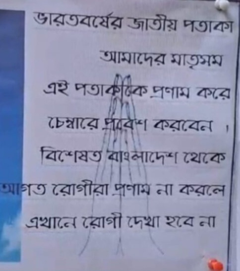सिलगढी: भारतको राष्ट्रिय झण्डालाई प्रणाम गरेपछि मात्र चेम्बरमा प्रवेश गर्ने अनुमति पाइने छ, अन्यथा बंगलादेशका बिरामीलाई चिकित्सा सेवा उपलब्ध गराइने छैन। सिलगढीका चर्चित चिकित्सक डा. शेखर ब्यानर्जीले यस् प्रकारको सन्देश प्रवाह गरेका छन्। बंगलादेशको भूमिमा भारतको राष्ट्रिय झण्डाको अपमान भइरहेको कारण भारतको राष्ट्रिय झण्डाको प्रतिष्ठा हनन गर्नेहरुका बिरुद्ध यो अभियान चलाइएको हो। यसको विरोधस्वरूप भारतका विभिन्न स्थानहरूमा धेरै चिकित्सा संस्थान र चिकित्सकहरूले बंगलादेशी बिरामीलाई सेवा दिन बन्द गर्न थालेका छन्। देशको राष्ट्रिय झण्डाको अपमान कुनै पनि चिकित्सक वा नागरिकका लागि स्वीकार्य छैन। बिरामीलाई चिकित्सा सेवा प्रदान गर्नु चिकित्सकको जिम्मेवारी र कर्तव्य पनि हो। यसै कारण सिलगढीका ईएनटी विशेषज्ञ डा. शेखर ब्यानर्जीले पनि अनौठो तरिकाले विरोध जनाएका छन्। उनले बंगलादेशी बिरामीहरूका लागि लेखेका छन्, “भारतको राष्ट्रिय झण्डा हाम्रो आमा सरह हो। यस झण्डालाई प्रणाम गरेपछि मात्र चेम्बरमा प्रवेश गर्न सकिने छ। यदि बंगलादेशबाट आएका बिरामीहरूले राष्ट्रिय झण्डामा प्रणाम गरेनन् भने यहाँ बिरामीको उपचार गरिने छैन।” सिलगढीमा उनले आफ्नो चेम्बरको बाहिर पनि राष्ट्रिय झण्डा राखेका छन्। यस क्रममा डा. ब्यानर्जीले भने, “बंगलादेशमा हाम्रो राष्ट्रिय झण्डाको अपमान गरेकोले म स्तब्ध छु। राष्ट्रिय झण्डाको अपमान स्वीकार्य छैन। त्यसैले मैले मेरो चेम्बरमा राष्ट्रिय झण्डा राखेको छु। बिरामीले प्रणाम गरेपछि मात्र उननिहरुलाई भित्र प्रबेश गर्न अनुमति दिइनेछ। तर एक चिकित्सकको रूपमा बिरामीको सेवा गर्नु मेरो कर्तव्य हो, त्यसैले म कहिल्यै पनि बिरामीलाई सेवा बिना जान दिने छुइँन।”