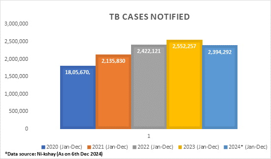 एनटीईपीअन्तर्गत भारतले टीबीका घटनाहरू घटाउने दिशामा महत्त्वपूर्ण प्रगति गरेको छ। यहाँ टीबीका घटनाहरूको दर सन् २०१५ मा प्रति १,००,००० जनसंख्यामा २३७ घटनाको तुलनामा सन् २०२३ मा प्रति १,००,००० जनसंख्यामा १९५ घटनासम्म १७.७ प्रतिशतले घटेको छ। त्यसैगरी, टीबीसँग सम्बन्धित मृत्युदर सन् २०१५ मा प्रति लाख जनसंख्यामा २८ मृत्युको तुलनामा सन् २०२३ मा प्रति लाख जनसंख्यामा २२ मृत्युमा झरेर २१.४ प्रतिशतले कमी आएको छ। पछिल्ला पाँच वर्षहरूमा टीबीका घटनाहरूको रिपोर्टिङमा निरन्तर वृद्धि देखिएको छ, जुन तलका तथ्यांकमा देख्न सकिन्छ: