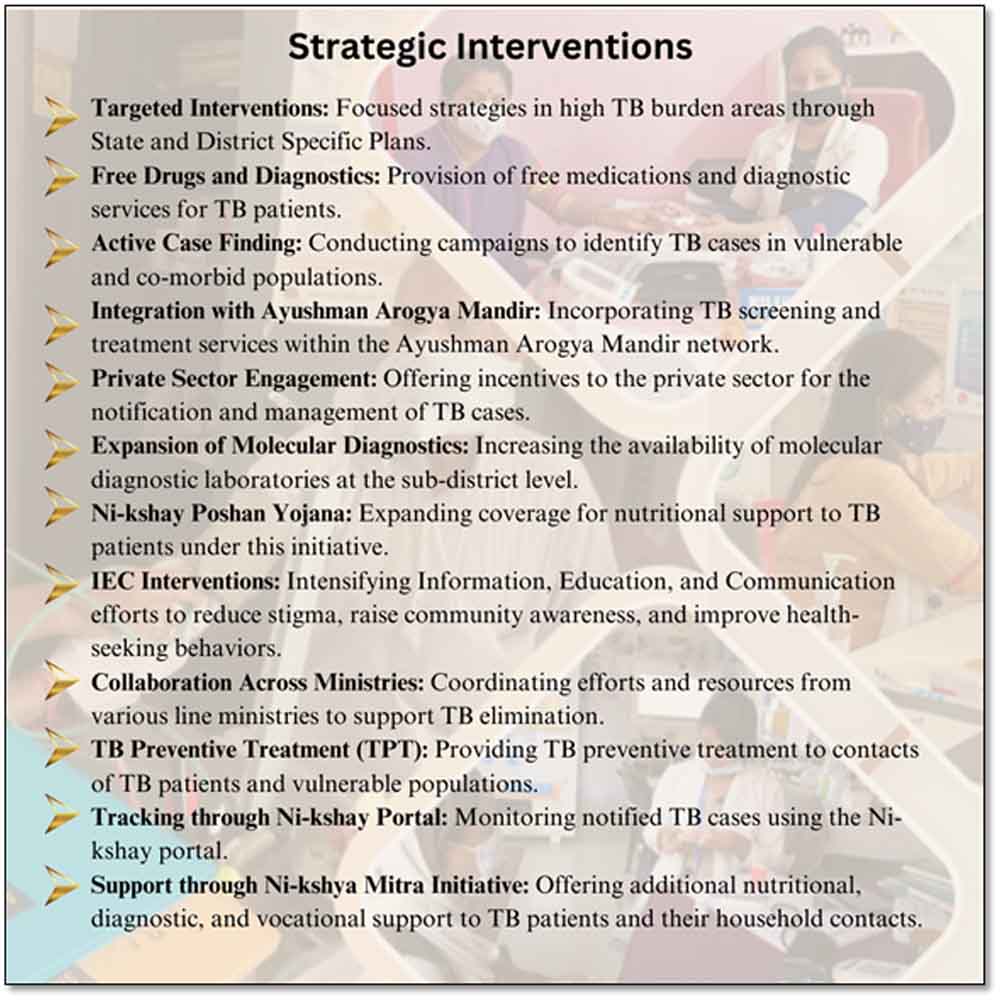 यो अभियान उन्नत निदानको पहुँच सुधार गर्न र उपचार सुरु गर्न ढिलाइ कम गर्न डिजाइन गरिएको विशेष रणनीतिहरूसहित उच्च टीबी बोझ भएका क्षेत्रहरूलाई लक्षित गर्नेछ। यसले आयुष्मान आरोग्य केन्द्रहरूको व्यापक नेटवर्कसहित वर्तमान स्वास्थ्य संरचनाको लाभ उठाउनेछ। यस अतिरिक्त, स्क्रिनिङ प्रयास उच्च जोखिम समूहहरूमा केन्द्रित हुनेछन्, र स्वास्थ्यसम्बन्धी थप चुनौतीहरूको सामना गरिरहेका व्यक्तिहरूका लागि विशेष हेरचाह प्याकेजहरू शुरु गरिनेछ। यो पहल टीबी बिरामीहरूलाई पोषणका लागि वित्तीय सहयोग प्रदान गर्ने “निक्षय पोषण योजना” मार्फत पोषण सहायता विस्तार गर्नेछ।