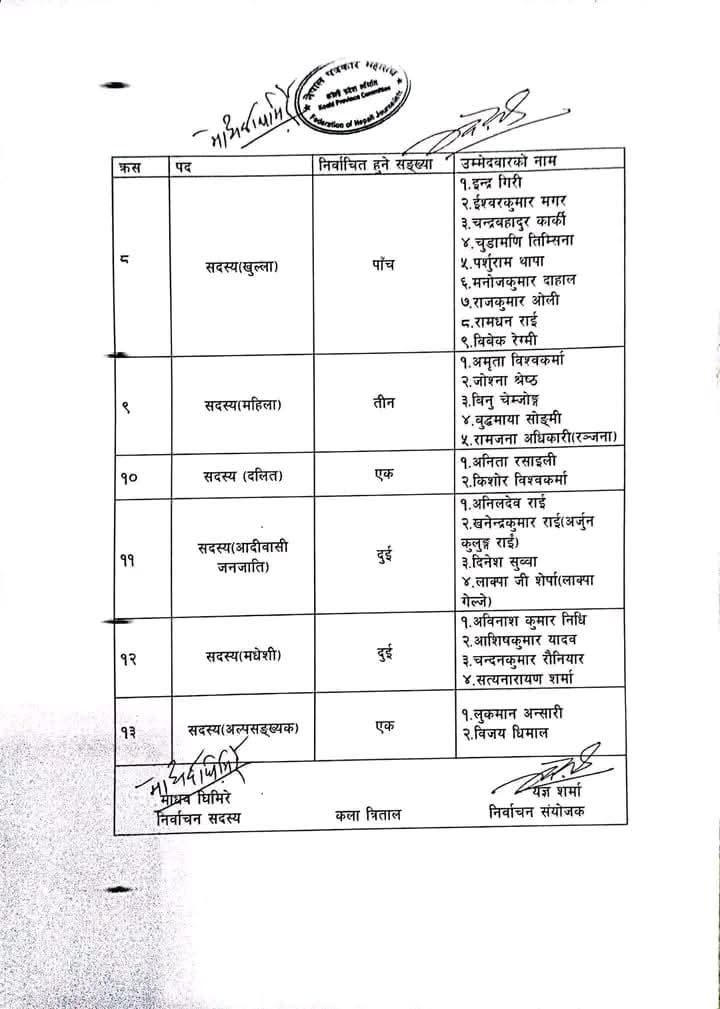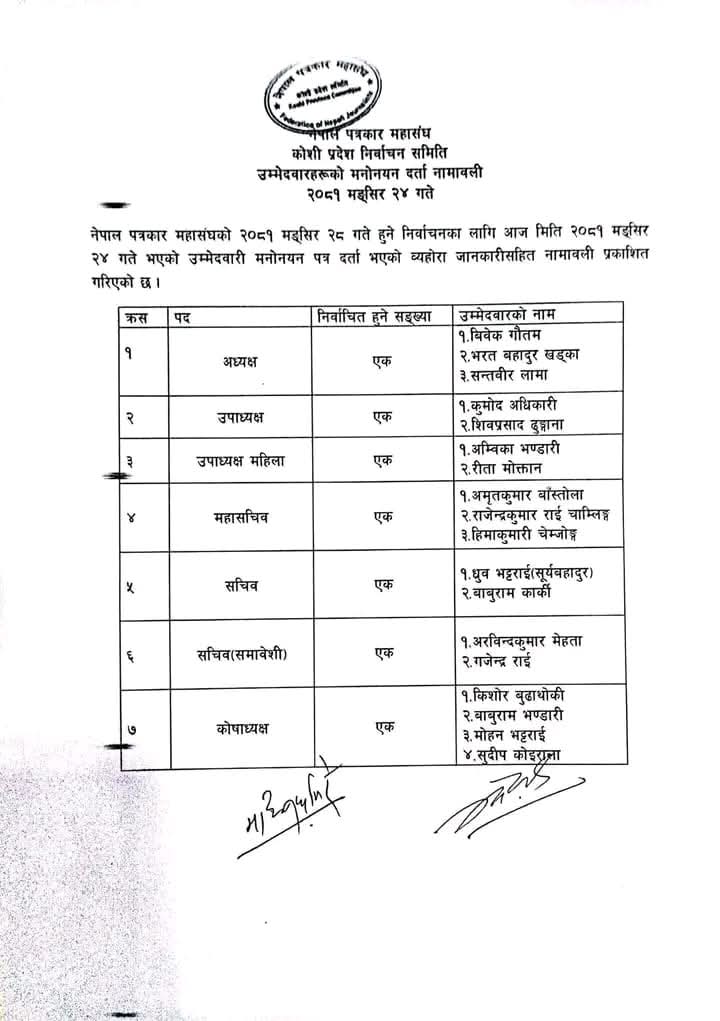 : नेपाल पत्रकार महासंघको यही डिसेम्बर १३मा हुने निर्वाचनमा कोशी प्रदेशको कार्यसमितिको अध्यक्ष पदका लागि तीनजनाको उम्मेदवारी दर्ता भएको छ। जसअनुसार अध्यक्षमा भरतबहादुर खड्का, विवेक गौतम र सन्तवीर लामाले उम्मेदवारी दर्ता गराएका छन्। यसैगरी उपाध्यक्षमा कुमोद अधिकारी र शिवप्रसाद ढुङ्गानाको उम्मेदवारी परेको छ। महिला उपाध्यक्षमा अम्बिका भण्डारी र रीता मोक्तान, महासचिवमा अमृतकुमार बाँस्तोला, राजेन्द्रकुमार राई (चाम्लिङ्ग) र हिमाकुमारी चेम्जोङ्गको उम्मेदवारी परेको छ।यसैगरी खुल्ला सचिवमा ध्रुव भट्टराई (सूर्यबहादुर) र बाबुराम कार्कीले उम्मेदवारी दिएका छन् भने समावेशी सचिवमा अरविन्दकुमार मेहता र गजेन्द्र राईको उम्मेदवारी परेको छ।कोषाध्यक्षमा किशोर बुढाथोकी, बाबुराम भण्डारी, मोहन भट्टराई र सुदीप कोइरालाको उम्मेदवारी परेको छ। यसैगरी खुल्ला सदस्यमा विवेक रेग्मी, इन्द्र गिरी, ईश्वरकुमार मगर, चन्द्रबहादुर कार्की, चुडामणि तिम्सिना, पर्शुराम थापा, मनोजकुमार दाहाल, राजकुमार ओली र रामधन राईको उम्मेदवारी परेको छ। यसैगरी महिला सदस्यमा अमृता विश्वकर्मा, जोश्ना श्रेष्ठ, बिनु चेम्जोङ्ग, बुद्धमाया सोमी र रामजना अधिकारी (रञ्जना) को उम्मेदवारी पर्दा दलित सदस्यमा अनिता रसाइली र किशोर विश्वकर्माको उम्मेदवारी परेको छ। यसैगरी सदस्य (आदिवासी जनजाती)तर्फ अनिलदेव राई, खनेन्द्रकुमार राई (अर्जुन कुलुङ्ग राई), दिनेश सुब्बा र लाक्पा जी शेर्पा (लाक्पा गेल्जे)को उम्मेदवारी परेको छ। यस्तै, सदस्य (मधेसी)तर्फ अविनाश कुमार निधि, आशिषकुमार यादव, चन्दनकुमार रौनियार र सत्यनारायण शर्माको उम्मेदवारी पर्दा सदस्य (अल्पसङ्ख्यक)तर्फ लुकमान अन्सारी र विजय धिमालको उम्मेदवारी परेको निर्वाचन अधिकृत यज्ञ शर्माले जानकारी दिए। कोशी प्रदेशका १४ वटै जिल्लाबाट आकांक्षीहरूले सोमबार प्रदेश पत्रकार महासंघको कार्यालय विराटनगरमा उम्मेदवारी दर्ता गराएका हुन्।