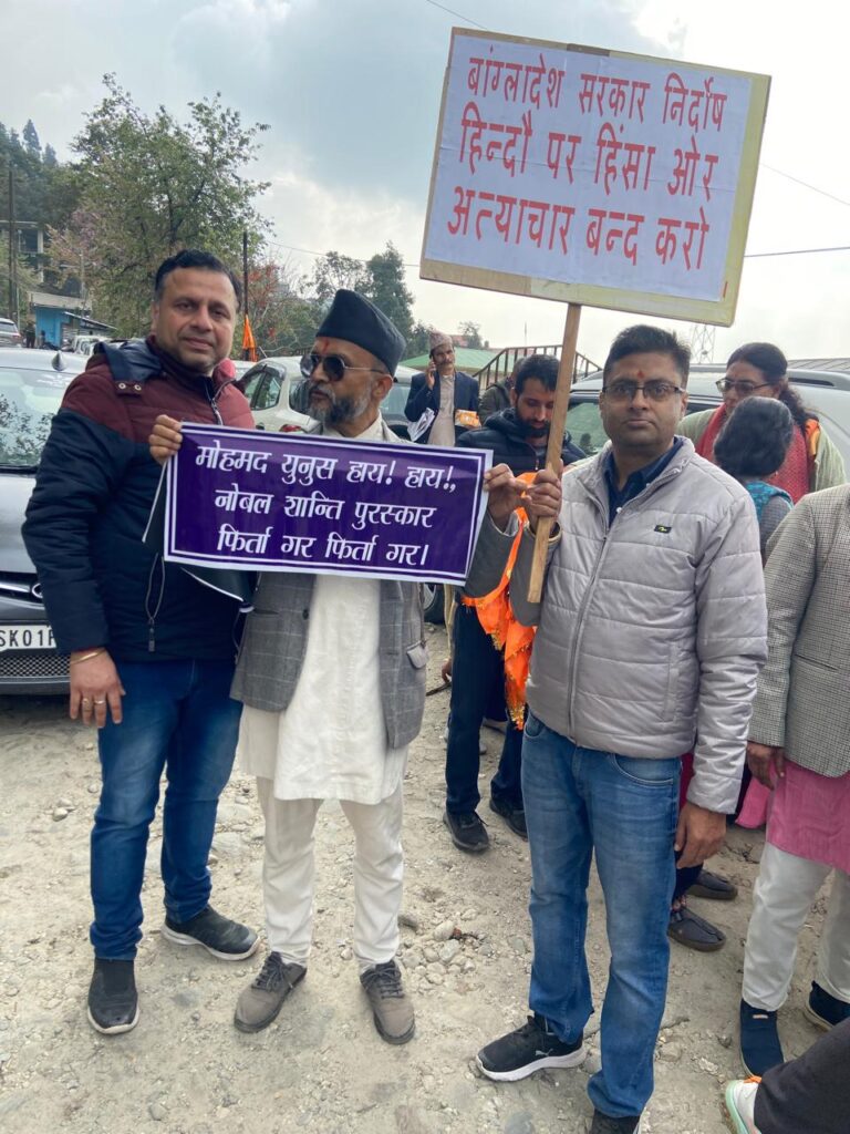 गान्तोक: बंगलादेशमा हिन्दू अल्पसंख्यकहरूमाथि भइरहेको अत्याचार र भारतको राष्ट्रिय झण्डाको अपमान गरिएको विरोधमा सिक्किममा पनि विरोधको स्वर उठेको छ। सिक्किम सनातन संगठनले आज गान्तोकको इन्दिरा बाइपासदेखि जिल्ला प्रशासन केन्द्र परिसरसम्म लगभग दुई सय समर्थकहरूको साथमा विरोध जुलुस निकाल्यो। बंगलादेशको वर्तमान अवस्थाको मुख्य कारक तत्व जर्ज सोरोज रहेको आरोप लगाउँदै संगठनका सदस्यहरूले प्रतिवाद तीब्र रूपमा गरेका छन्। यसैगरि बंगलादेशका राष्ट्रपति महोम्मद शाहबुद्धिन अनि अन्तरमि सरकारको मुख्य सल्लाहकार मोहम्मद युनुस नोबल शान्ति पुरस्कार पाएका व्यक्ति भएर पनि अल्पसंख्यक हिन्दूहरूप्रति नकरात्मक भएको टिप्पणी गर्दै शाहबुद्धिन र युनुसको विरोधमा जोडतोडले नारा लगाउँदै प्रतिवाद गरे। अल्पसंख्यक हिन्दू माथिको अत्याचार र भारतको राष्ट्रिय झण्डालाई अपमान गरेको विरोधमा सिक्किमका अतिरिक्त मुख्य सचिव आर तेलाङलाई टासिलिङ सचिवालय पुगेर एउटा ज्ञापन पक्ष पनि सुम्पिएको छ।