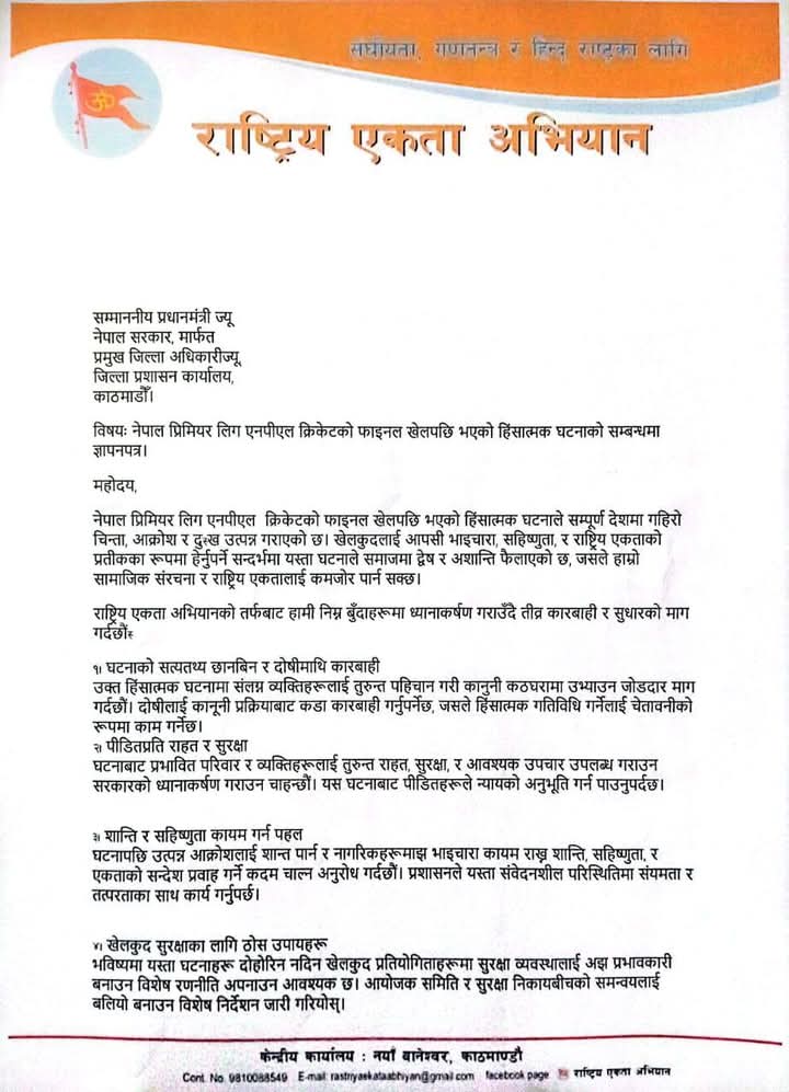 काठमाण्डू: राष्ट्रिय एकता अभियान काठमांड़ौले नेपाल प्रिमियर लिग (एनपीएल) क्रिकेटको फाइनल खेलपछि भएको हिंसात्मक घटनामा संलग्नलाई कार्यवाहीका लागि जिल्ला प्रशासन कार्यालय काठमांड़ौ मार्फत सरकारलाई ज्ञापनपत्र बुझाएको छ। जिल्ला संयोजक राजकुमार लामीछानेको नेतृत्वमा गएको टोली ले प्रमुख जिल्ला अधिकरीलाई ज्ञापन पत्र बुझाई दोषीलाई कड़ा कारवाही गर्न मांग गरेको छ।