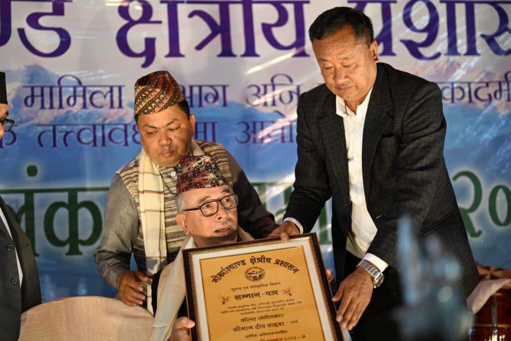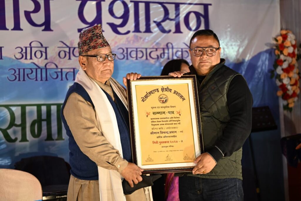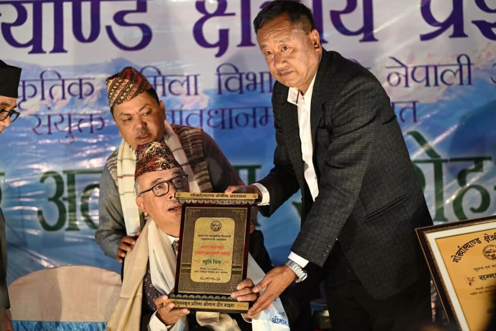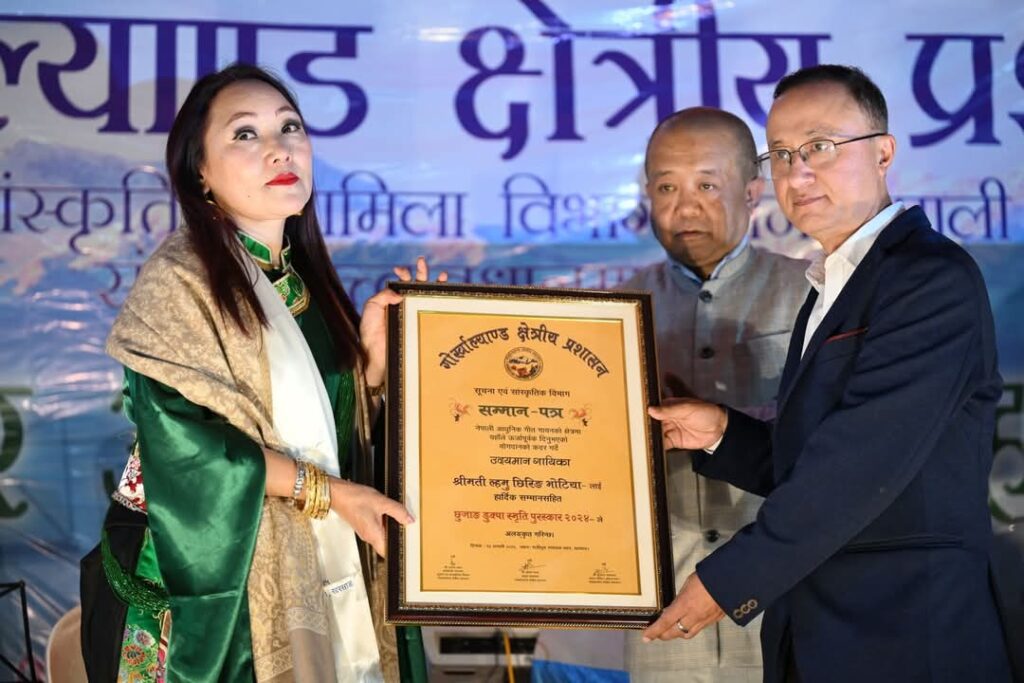 खरसाङ: जीटीएको सूचना अनि सांस्कृतिक विभागको आयोजनामा आज गाडीधुरा सार्वजनिक भवनमा पुरस्कार अलङ्करण समारोह सम्पन्न भयो। कार्यक्रममा मुख्य अतिथिको रुपमा जीटीएका मुख्य कार्यपाल अनित थापा उपस्थित रहेका थिए भने विशिष्ट अतिथिको रूपमा जीटीए सभाका अध्यक्ष अञ्जुल चौहान, उपाध्यक्ष राजेश चौहान, सचिव सुदेन छिरिङ भूटिया, मुख्य कार्यपालका सल्लाहकार गोपाल लामा, सूचना एवम् सास्कृतिक विभाग कार्यकारीसभासद अनोश थापा, सङ्गीतकार शान्ति ठटाल, वरिष्ठ साहित्यकार डा0 गोकुल सिन्हा लगायत विभिन्न विभागीय अधिकारीहरू, गायक, सङ्गीतकारहरू, जीटीए सभाका सभासदहरू, पञ्चायत समिति अध्यक्षहरू, पञ्चायत प्रधान, उपप्रधान तथा सदस्यहरू, कवि, साहित्यकारहरू आदिको विशेष उपस्थिति रहेको थियो। भानुकान्त घिसिङ, सबिना गिरी अनि विमल राईद्वारा संयुक्त रूपमा सञ्चालित समारोहमा संगीत विधाको छुजाङ डुक्पा स्मृति पुरस्कार प्रख्यात गायिका लम्हु छिरिङ भूटियालाई प्रदान गरियो भने संगीत विधामा अरूणा लामा स्मृति पुरस्कार सङ्गीतकार दीप वाइबालाई प्रदान गरियो। त्यसरी नै नाट्य विधामा शिवकुमार राई स्मृति पुरस्कार कलाकार मेनुका प्रधानलाई प्रदान गरियो भने साहित्य विधामा गिरी पुरस्कार वरिष्ठ साहित्यकार विचन्द्र प्रधानलाई प्रदान गरियो। यी सम्मानहरू मुख्य अतिथि अनित थापा, विशिष्ट अतिथिहरू अञ्जुल चौहान, राजेश चौहान, कार्यकारि सभासद अनोश थापा, सचिव सुदेन छिरिङ भूटिया आदिको बाहुलीबाट प्रदान गरियो। उनीहरूलाई खदा लगाएर शाल तथा जातिय टोपी लगिएर अनि सम्मानपत्र, स्मृति चिन्ह तथा नगद राशि प्रदान गरेर सम्मान जनाइयो भने उनीहरूलाई प्रदान गरिएको सम्मानपत्र मुकुन्दमणि थापा, लाक्पा शेर्पा, सबिना गिरी अनि सुरज गुरूङले पठन गरेका थिए। समारोहमा सूचना एवम् सास्कृतिक विभाग, खरसाङका कलाकारहरूले सांगीतिक प्रस्तुतिहरू दिए भने सम्मानित व्यक्तित्वहरूले उनीहरूलाई यसरी सम्मान जनाइएकोमा जीटीएप्रति आभार व्यक्त गरे। कार्यक्रमपछि पत्रकारहरूलाई सम्बोधन गर्दै जीटीए मुख्य कार्यपाल अनित थापाले जीटीएले सदैव हाम्रा समाजका विशिष्ट व्यक्तिहरूलाई सम्मान गर्दै आइरहेको तथा भाषा, साहित्य, संगीत एवम् अन्य विधाहरूमा वर्तमान समयका युवावर्गलाई प्रेरणा अनि प्रोत्साहन दिने उद्देश्यले यस्ता कार्यक्रमहरू गरिरहेको जनाए। तिनले आगामी दिनहरूमा पनि यस्ता धेरै कार्यक्रमहरू गरिने जनाए। समारोहलाई सफल पार्न सहयोग पुऱ्याउने सबैप्रति जीटीए कार्यकारि सभासद अनोश अनोश थापाले आभार प्रकट गरे।