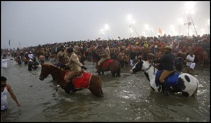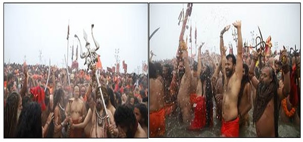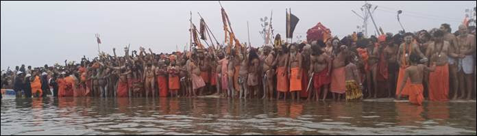 लाखौं मानिसको यस भीड बीच सन्तहरूका अखाडाको स्नान विशेष रूपले दर्शनीय थियो। पञ्चायती अखाडा महानिर्वाणीका नागा साधुहरूले भव्यताका साथ शाही अमृत स्नान गरे। भाला, त्रिशूल अनि तलवारले सुशोभित उनीहरू एक जुलूसमा भीडका बीच निक्ले जुन कुनै राजसी आगमनभन्दा कम थिएन। घोडा अनि रथहरूमा सवार भई उनीहरूका तपस्वी रूपले आध्यात्मिक ऊर्जा सञ्चार गर्दै उपस्थित जनसमुदायलाई सम्मोहित गेरको थियो। यसपछि भजन मण्डलीहरूका स्वरलहरीले स्थिति मनमोहक बनाएको थियो भने भजनका बीच भक्तजनको “हर हर महादेव” र “जय श्रीराम”को उद्घोषले हावामा दिव्य लयका साथ अलौकिक कम्पन उत्पन्न गरेको थियो।