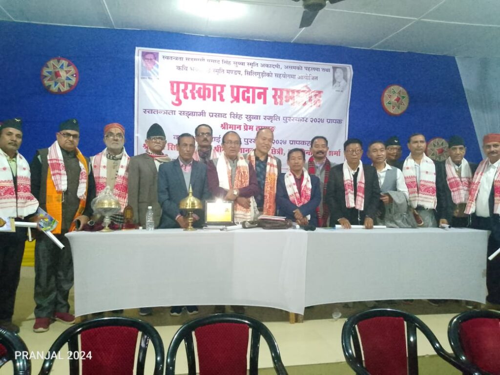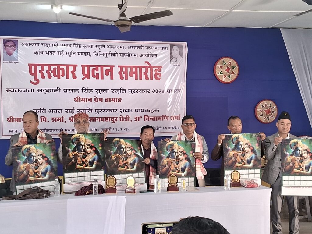 गुवाहाटी: असम गोर्खे गान्धीस्वतन्त्रता सेनानी प्रसादसिंह सुब्बा स्मृति अकादमी, असमले कविवर भक्त राई स्मृति मण्डपको संयोजनमा आयोजना गरेको पुरस्कार वितरण समारोह गत ११ जनवरी शनिबार, विश्वनाथ कलेजको कला भवन हल, चाराली, असममा सम्पन्न भयो। उक्त एक दिवसीय कार्यक्रम बिहान संस्थागत झण्डा फहराएर शुरु भएको थियोl स्मृति अकादमीका अध्यक्ष छत्रमान सुब्बाले प्रमूख अतिथि अरुण कृष्ण राई, पूर्व न्यायाधीशको उपस्थितिमा आरम्भ गरे। त्यसपछि प्रारम्भिक कार्यक्रमको शुरुवात स्वतन्त्रता सेनानी प्रसादसिंह सुब्बा असम गोर्खे गान्धी र कविवर भक्त राईको तस्वीरमा दीप प्रज्वलन र प्रतिष्ठानका कार्याध्यक्ष प्रकाश सुब्बा र परिवारका सदस्यले पुष्पहार अर्पण गरी शुरु भएको थियो। अधिवेशनको प्रारम्भमा गुवाहाटी उच्च अदालतका वरिष्ठ अधिवक्ता जयन्त पराजुली र साहित्य अनुवाद अकादमी पुरस्कार विजेता किरणकुमार राई र उदीयमान पत्रकार चन्दन छेत्रीको असामायिक निधन भएको हुनाले गतात्मक आत्माप्रति शान्तिको एक मिनट मौन धारण गरिएपछि असम नेपाली साहित्य सभाको विश्वनाथ चाराली शहर शाखाका टोलीका सदस्यहरूले कोरस सुमधुर सङ्गीत प्रस्तुत गरे। स्वतन्त्रता सेनानी प्रसादसिंह सुब्बा एकाडेमीका उपाध्यक्ष पूर्णकुमार शर्माले स्वागत सम्भाषण राखे। साहित्य अकादमीका सल्लाहकार मण्डलका सदस्य डा चन्द्रमणि उपाध्यायले स्वर्गीय स्वतन्त्रता सेनानी असम गोर्खे गान्धी प्रसादसिंह सुब्बाको जीवनी र योगदानबारे स्मरण प्रवचन दिए। मानसिरी उच्चोत्तर विद्यालयका सेवानिवृत्त प्रधानाध्यापक एच एस शर्माद्वारा एकाडेमीको नयाँ वर्षको क्यालेन्डर विमोचन गरे। प्रा. रामचन्द्र अधिकारीले कविवर भक्त राईको जीवनी र साहित्यिक योगदानको बारेमा स्मृति व्याख्यान दिए। भाषा संवैधानिक स्वीकृतिकालमा दस्तावेजको रुपमा दिल्ली अधिकृतवर्ग समक्ष महाकाव्यको विधामा भारतीय नेपाली/गोर्खा साहित्यको प्रथम महाकवि मोहन दुखन विरचित प्रथम महाकाव्य “मन्दाकिनी”लाई प्रस्तुत गरेको अलिखित ऐतिहासिक तथ्य अघि सार्दै प्रा. अधिकारीले भने, कविवर भक्त राई उनकै शाखे काइलो भाई पनि प्रतिभावान युवा कवि थिए।