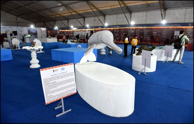 “गङ्गाको बाघ”का रूपमा जानिने गङ्गा नदीको डल्फिन माछाको प्रतिकृतिले स्थानीय वन्य जीवन प्रदर्शित गर्दै मण्डपमा गर्वका साथ खडा देखिन्छ।