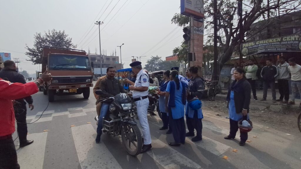सिलगढी: सडक सुरक्षा सप्ताहको अवसरमा नयाँ जलपाईगढी ट्राफिक पुलिसले आज बाइपास भीआईपी क्षेत्रमा जागरूकता अभियान शुरु गर्यो। हेल्मेट बिना बाइक चलाउनेहरूलाई गुलाबको फूल र हेल्मेट प्रदान गरिएको थियो। हेल्मेट नलगाउँदा के हुनसक्छ भनेर ट्राफिक पुलिसले बतायोl सिट बेल्ट नलगाई गाडी चलाउनेहरूलाई सिट बेल्ट लगाउन अनुरोध गरिएको थियो। यसैबीच, हेल्मेट नलगाई पुलिसबाट भाग्न खोज्दा एक स्कुटर चालक लडे र ट्राफिक पुलिसले उनलाई राम्रो व्यवहार गर्दै हेल्मेट र फूल दिएर हेल्मेट लगाएर बाइक चलाउन मनाएको बताए। पुलिसको गान्धीगिरीबाट सबैजना धेरै खुशी देखिन्थे।
