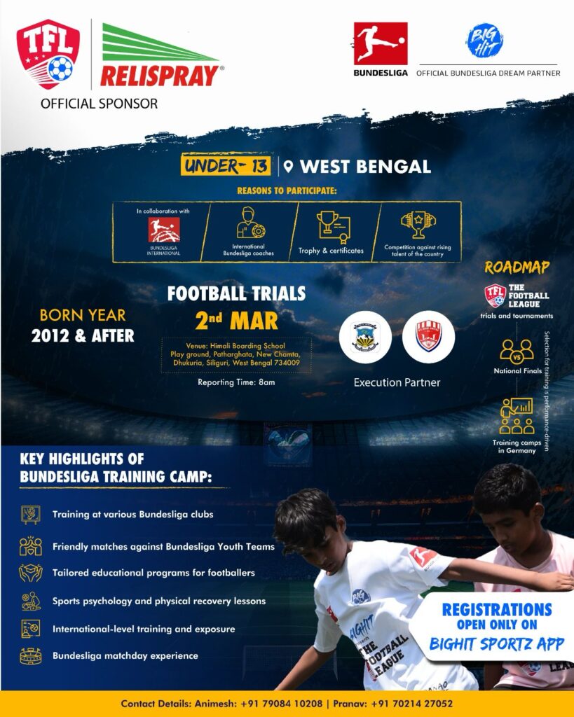 सिलगढ़ी: बिग हिट को तत्त्वावधानमा युवा फूटबल खेलाड़ीहरूका निम्ति जर्मनीमा गएर त्यहाँको शीर्ष क्लबहरूमा प्रशिक्षण हासिल गर्ने सुनौलो मौका आएको छ। सिलगढ़ी युनाइटेड फूटबल क्लबको सहयोगमा बिग हिट-ले २ मार्चमा अण्डर-१३ र अण्डर-१५ आयु वर्गको ट्रायल हुनेछ। ट्रायलको आयोजन हिमाली बोर्डिंग स्कूल खेल मैदानमा हुनेछ। ट्रायल बिहान ८ बजीदेखि शुरु हुनेछ। ट्रायलको निम्ति इच्छुक खेलाड़ीहरूले बिग हिट एप्प डाउनलोड गरेर आवेदन गर्न सक्नेछन्। ट्रायलको विभिन्न स्तरहरू पार गरेपछि खेलाड़ीहरूले बायर्न म्यूनिख, एफसी फ्रेंकफर्ट र अन्य जर्मन क्लबहरूमा प्रशिक्षण हासिल गर्ने मौका पाउनेछन्।