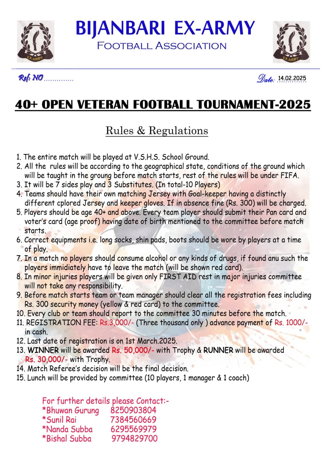 दार्जीलिङ: बिजनबारी एक्स-आर्मी फूटबल एसोसिएशनको तत्त्वावधानमा फोर्टी प्लस (४०+) भेटरन्स टुर्नामेण्टको आयोजन गरिनेछ। टुर्नामेण्टका सबै म्याचहरू भी.एस.एच.एस. स्कूल मैदानमा खेलिनेछ। यस सेवेन ए साइड टुर्नामेण्टमा च्याम्पियन हुने टीमलाई आकर्षक ट्रफीको साथमा ५० हजार रुपियाँको नगद पुरस्कार प्रदान गरिनेछ। यसरी रनरअप हुने टीमलाई आकर्षक ट्रफीको साथमा ३० हजार रुपियाँको नगद पुरस्कार प्रदान गरिनेछ। अंशग्रहण गर्न इच्छुक टीमहरूका निम्ति प्रवेश शुल्क ३ हजार रुपियाँ रहेको छ। अन्य जानकारीहरू आयोजक समितिद्वारा जारी सर्कुलरमा उपलब्ध रहेको छ।