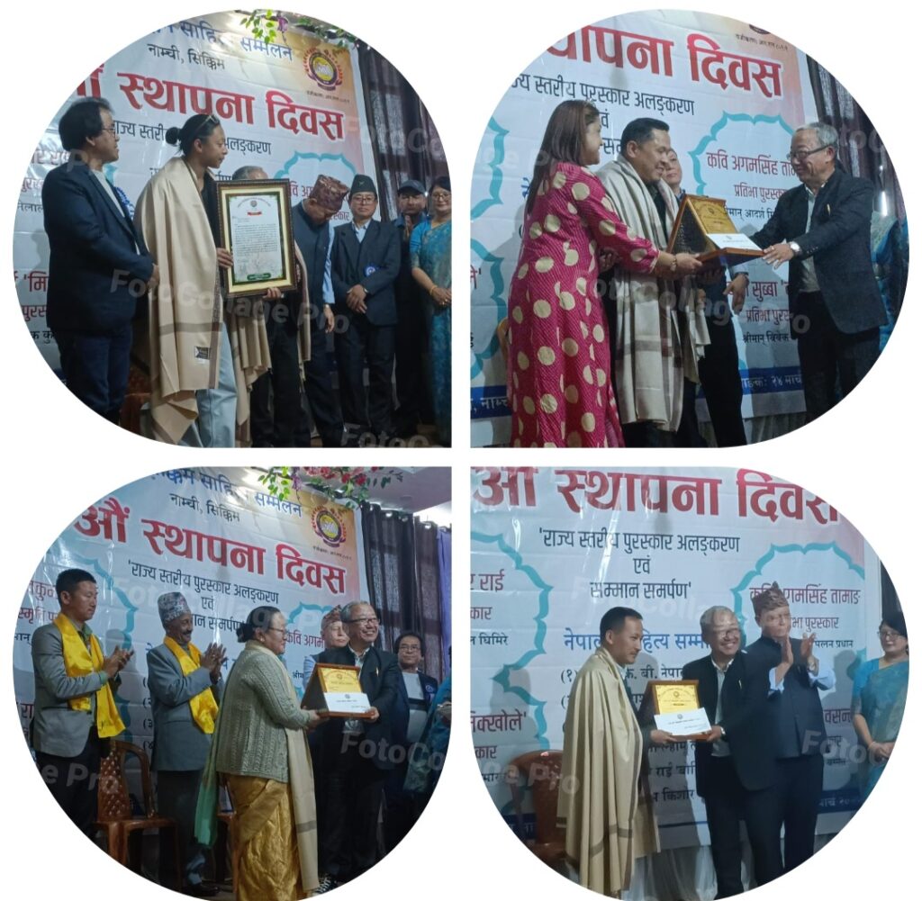 नाम्ची: दक्षिण सिक्किम साहित्य सम्मेलनको ३०औं स्थापना दिवस साथै राज्य स्तरीय पुरस्कार अलङ्करण तथा सम्मान समर्पण २०२५ सम्पन्न भएको छ। २४ मार्च १९९५ सालमा स्थापना भएको दक्षिण सिक्किम साहित्य सम्मेलनको आज आफ्नो ३०औं स्थापना दिवस समारोह सम्पन्न भएको छ। उक्त कार्यक्रम दक्षिण सिक्किमको नाम्चीस्थित अफिसर्स क्लबमा भव्यताका साथ सम्पन्न भएको छ। यस कार्यक्रमको अध्यक्षता दक्षिण सिक्किम साहित्य सम्मेलनको पूर्व अध्यक्ष एंव वर्तमान सल्लाहकार डा नयन राईले गरेका थिए भने प्रमुख अतिथिको रूपमा वरिष्ठ साहित्यकार एंव शिक्षाविद् धन ‘निर्दोष’ सुब्बा उपस्थित रहेका थिए। दक्षिण सिक्किम साहित्य सम्मेलनको महासचिव सुरेश सुब्बा ‘बियोगी’ ले सञ्चालन गरेको कार्यक्रममा स्वागत सम्भाषण सम्मेलनको अध्यक्ष दलमान डी गुरुङले राखेका थिए। एजुकेयर एकाडेमीको नानीहरुले नृत्य प्रस्तुत गरेको कार्यक्रममा दक्षिण सिक्किम साहित्य सम्मेलनको १९९५ सालदेखि आजसम्मको दस्तावेज रहेको पुस्तक अतिथिहरुका बाहुलीबाट लोकार्पण गरिएको छ। यसै कार्यक्रममा दक्षिण सिक्किम साहित्य सम्मेलनको तर्फबाट सिक्किमको तीनजना र सिक्किमदेखि बाहिरका तीनजना साहित्यकारहरुलाई नेपाली साहित्य सम्मानद्वारा सम्मानित गरिएको छ। सम्मानित हुनेहरुमा आसामका केबी नेपाली, खरसाङकी आशा मुखिया लामा, सोरेङका प्रकाश भट्टराई, देन्तामकी रिक्की ल्हमु लेप्चा, मणिपुरका राहुल राई बोगिको, सुम्बुकका विक्रम किशोर गौतम आदि रहेका छन्। यसै कार्यक्रममा कविता वाचन कार्यक्रम पनि आयोजना गरिएको थियो जसमा अबिगेल राई, सीएल ओझा, रोशन राई आदिले कविता वाचन गरेका थिए ॐ। यस कार्यक्रमलाई पेम नर्बु शेर्पाले सञ्चालन गरेका थिए। कार्यक्रममा प्रमुख अतिथिको रुपमा उपस्थित वरिष्ठ साहित्यकार एंव शिक्षाविद् धन निर्दोष सुब्बा र नेपालमा आयोजित पोयट आईडल सिजन दुईको विजेता सिक्किमका कवि सिमियोन सुकिता राईलाई पनि सम्मानित गरिएको छ। कार्यक्रममा कवि सिमियोन सुकिता राईले कविता पनि वाचन गरेका थिए। कार्यक्रममा शिवकुमार राई, अगमसिंह तामाङ, बलि सुब्बा बसन्त र एल्डी राई मिक्खोले आदिको परिचायात्मक जानकारी गणेश छेत्रीले राखेका थिए। यसै कार्यक्रममा दक्षिण सिक्किम साहित्य सम्मेलनको तर्फबाट वार्षिक रुपमा प्रदान गरिने विभिन्न पुरस्कारहरु अलङ्करण गरिएको छ।
