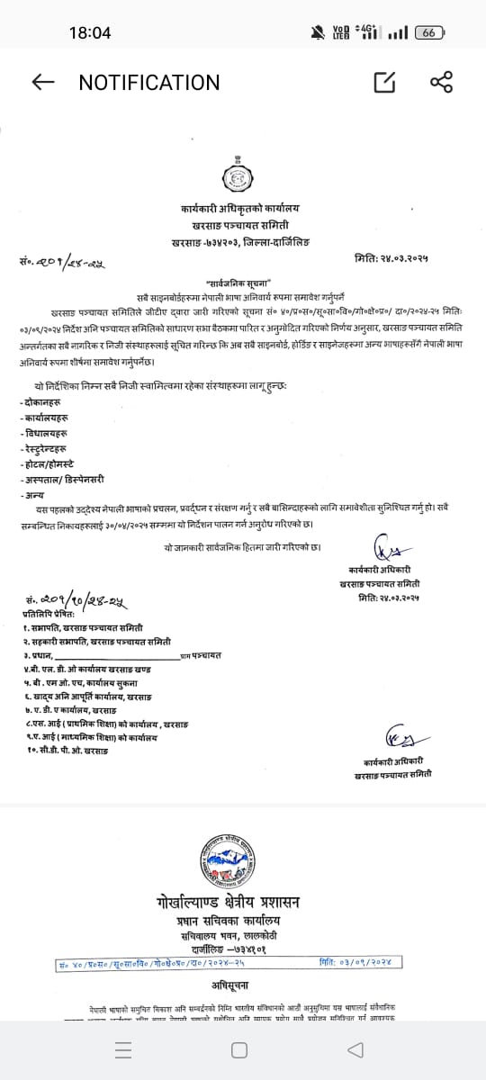 खरसाङ: खरसाङ खण्ड पञ्चायत समिति अन्तर्गत पर्ने सबै स्थानहरुमा रहेको साइन बोर्डहरुमा नेपाली भाषामा नै लेख्नु पर्ने सार्वजनिक सूचना जारी गरेका छन्। जीटीएले सबै साइन बोर्डहरुमा नेपाली भाषामा लेख्नु पर्ने भनेर जारी गरेको निर्देशनलाई खरसाङ खण्ड पञ्चायत समितिले साधारण सभा गरेर सहमति जनाउँदै पारित र अनुमोदित निर्णय अनुसार खरसाङ पञ्चायत समिति अन्तर्गत पर्ने स्थानहरुमा नेपाली भाषामा नै लेखिनु पर्ने सार्वजनिक सूचना जारी गरिएको छ। खरसाङ खण्ड पञ्चायत समिति अन्तर्गत पर्ने सबै नागरिक र निजी संस्थानहरूलाई सूचित गरिएको छ कि अब सबै साइन बोर्डहरु, होर्डिङ्ग र साइनेजहरुमा अन्य भाषाहरुसँगै नेपाली भाषामा पनि अनिवार्य रुपमा शीर्षमा लेखिनु पर्ने सार्वजनिक सूचना जारी गरिएको जानकारी प्राप्त भएको छ। उक्त निर्देशिका दोकानहरु, कार्यालयहरु, विद्यालयहरु, रेस्टुरेन्टहरु, होटल र होम स्टेहरु, अस्पताल र डिस्पेन्सरी लगायत अन्यहरुमा अनिवार्य रुपमा नेपाली भाषामा लेखिनु पर्ने सार्वजनिक सूचना जारी गरिएको छ। यस पहलको उद्देश्य नेपाली भाषाको प्रचलन, प्रबर्द्धन र संरक्षण सुनिश्चित गर्नु साथै सबै नागरिकहरुको समावेशीता सुनिश्चित गर्नु रहेको बताइएको छ।