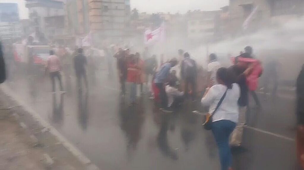 त्यसलगत्तै जुलुसमा उपस्थित भीडबाट पुलिसमाथि ढुंगा प्रहार भएको बताइएको छ। स्थिति नियन्त्रणमा लिन पुलिसले पानीको फोहोरा प्रयोग गरेको थियो। आँश्रु ग्यास संगै स्टन ग्रेनेड पनि प्रहार गरिए। यसपछि पनि कार्यकर्ता र समर्थकहरु पछि हटेनन् भने पुलिसले लाठी प्रहार गरी आन्दोलनकारीलाई तितरबितर पारेको थियो। पुलिसले लाठीचार्ज गर्दा स्थिति थप तनावपूर्ण बनेको छ। जसका कारण दुवै पक्षबीच झडप भएको थियो।