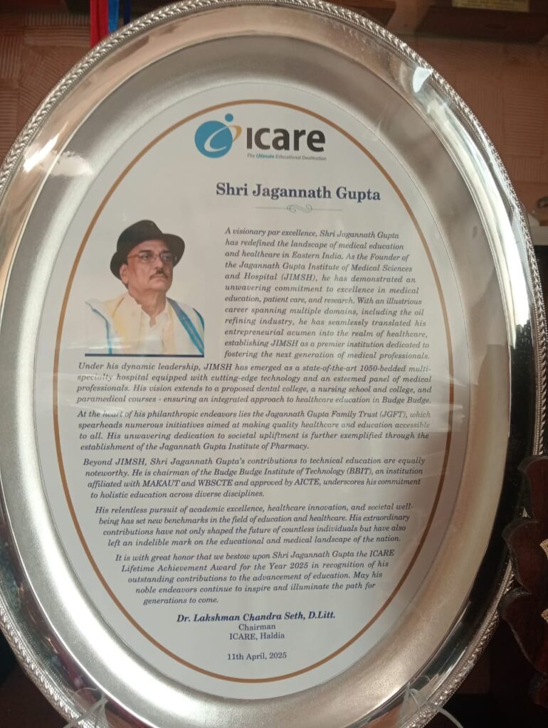 हल्दिया: भारतीय अनुसंधान एवं शिक्षा उन्नयन केंद्र, हल्दिया, पूर्व मेदिनीपुर (आईसीएआरई)ले अप्रिल ११, २०२५ माशिक्षा क्षेत्रमा उत्कृष्ट र अद्वितीय योगदानको कदरस्वरूप श्री जगन्नाथ गुप्तालाई “लाइफटाइम अचिभमेन्ट अवार्ड २०२५” प्रदान गरेकाे छ।