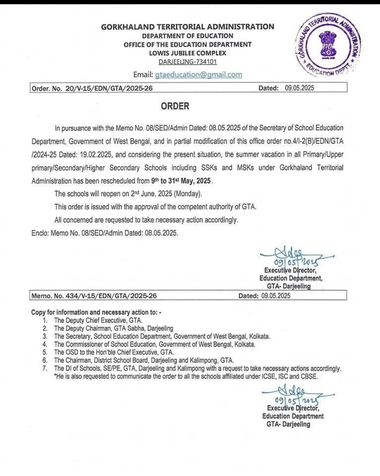 दार्जिलिङ: गोर्खाल्याण्ड क्षेत्रीय प्रशासन (जीटीए) अन्तर्गत रहेका सबै विद्यालयहरूमा भोलिदेखि ग्रीष्मकालीन छुट्टी लागु हुने भएको छ। देशको वर्तमान परिस्थितिलाई मध्यनजर गर्दै जीटीएको शिक्षा विभागले आज एक आधिकारिक आदेश जारी गर्दै विद्यालयहरू अस्थायी रूपमा बन्द गर्ने निर्णय लिएको हो। शिक्षा विभागद्वारा जारी सूचनामा भनिएको छ कि सबै सरकारी, सरकारी सहायता प्राप्त तथा निजी विद्यालयहरूमा भोलि बाट ग्रीष्मकालीन छुट्टी सुरु हुनेछ। छुट्टीको अवधि र विद्यालय पुनः सञ्चालनको मिति २ जून २०२५ रहेको छ।