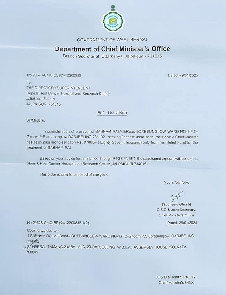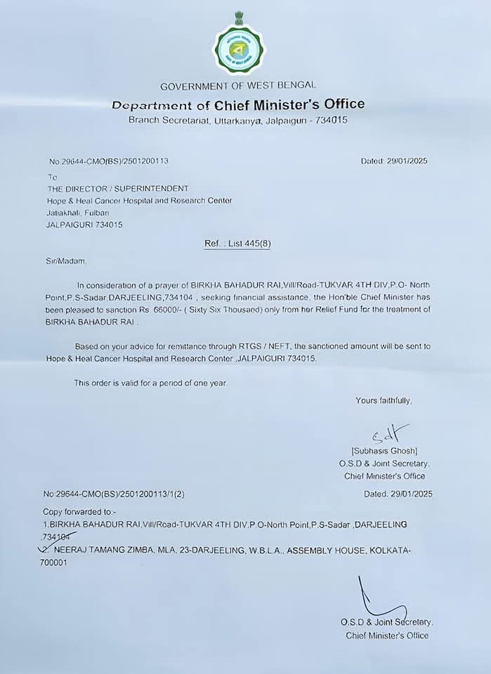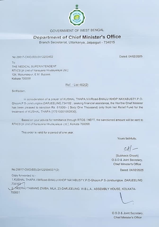 दार्जिलिङ: दार्जीलिङ विधानसभा क्षेत्रका विधायक तथा गोर्खा राष्ट्रिय मुक्ति मोर्चा केन्द्रीय समितिका सेक्रेटरी निरज जिम्बाको सक्रिय पहल र सिफारिसमा चारजना आर्थिक रुपमा कमजोर बिरामीलाई पश्चिम बंगाल सरकारको मुख्यमन्त्री राहत कोषमार्फत् आवश्यक उपचार खर्चको सहायता स्वीकृत गरिएको छ।