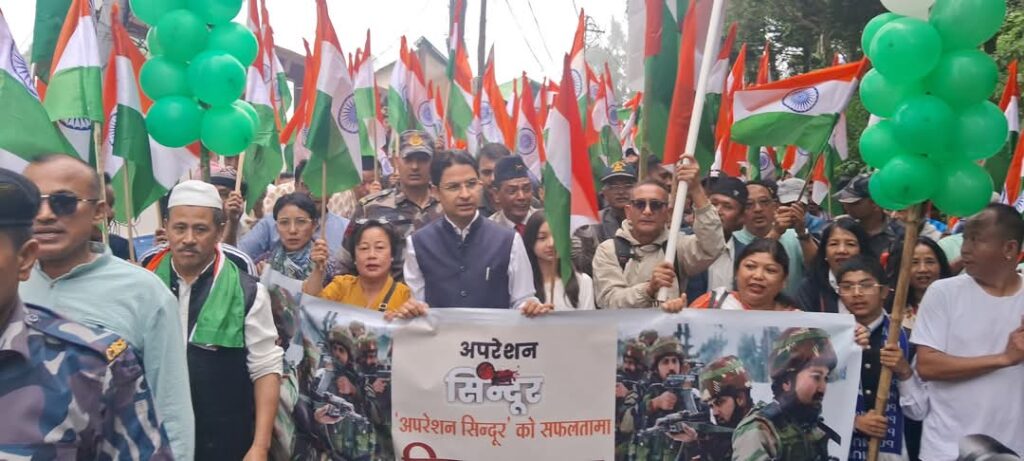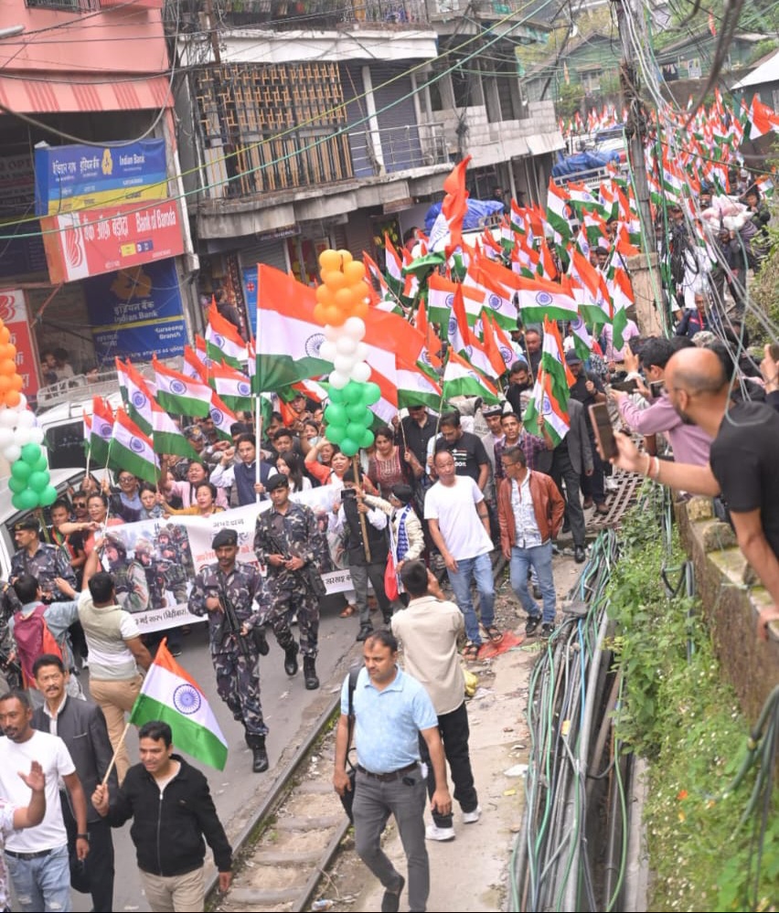 खरसाङ: अपरेशन सिन्दुरको सफलतामा भारतीय सेनालाई बधाई दिन्दै आज खरसाङमा तिरंगा यात्रा निकालिएको छ। दार्जिलिङको सांसद राजु विष्टको विशेष उपस्थितिमा खरसाङमा निकालिएको उक्त तिरंगा यात्रामा खरसाङ क्षेत्रका विभिन्न संघ संस्थाहरु लगायत भूतपूर्व सैनिक संगठनका प्रतिनिधिहरु र स्थानीयहरु उपस्थित रहेका थिए। उक्त तिरंगा यात्रा खरसाङको टुरिस्ट लजदेखि शुरु भएर राष्ट्रिय राजमार्ग हुँदै अस्पताल मोड भएर वर्द्धवान रोड भएर मोटर स्ट्याण्ड र रेलवे स्टेशन परिसरमा पुगेर समापन गरिएको छ। यस तिरंगा यात्रामा सिन्दुर अपरेशनमा पाएको सफलताले लागि भारतीय सैनिकप्रति आभार प्रकट गरिएको छ। यस तिरंगा यात्रामा ‘हिन्दुस्तान जिन्दावाद’, ‘भारत माताकी जय’, ‘बन्दे मातारम’ जस्ता नाराहरु लगाइएको थियो। उक्त तिंरगा यात्रा रेलवे स्टेशन परिसरमा पुगेर पथ सभामा परिणत भएको छ।
