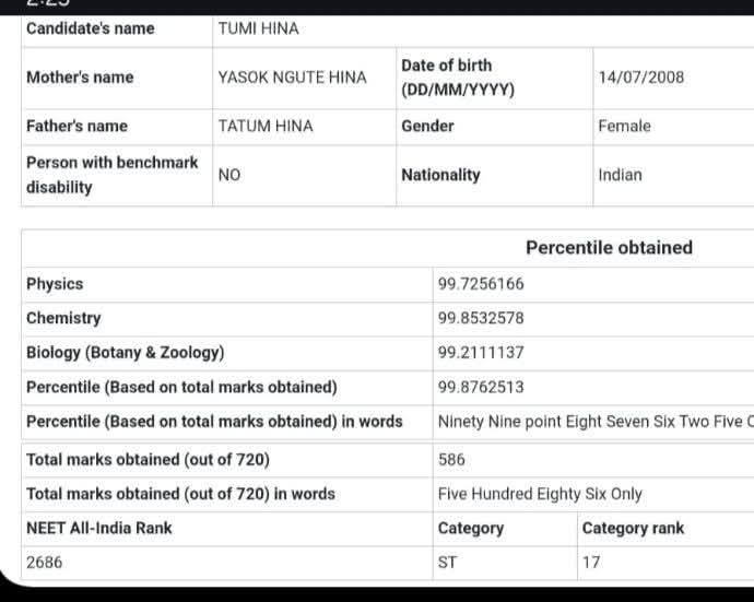 ईटानगर: तुमी हिना अरुणाचल प्रदेशमा नीट २०२५ मा शीर्ष स्थानमा छिन्, उनले प्रभावशाली ९९.८७ प्रतिशत अंक प्राप्त गरेकी छिन्। राज्यबाट उपस्थित भएका ५,१३४ उम्मेदवारहरूमध्ये २,६४५ विद्यार्थीहरू योग्य भए, जुन एक महत्वपूर्ण सफलता दर हो।