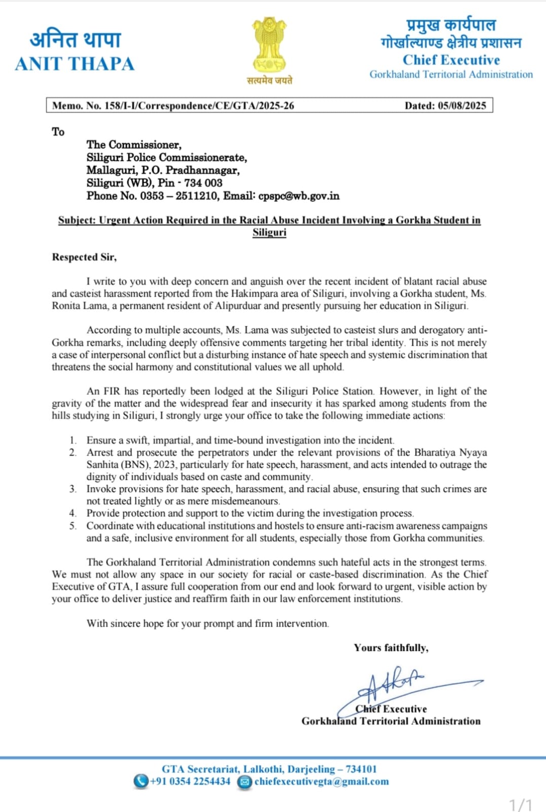 सिलगढी: सिलगढीको हाकिमपाडा क्षेत्रका एक शिक्षण संस्थामा अध्ययनरत गोर्खा विद्यार्थीमाथि जातीय तथा जातीय अपमानजनक व्यवहार भएको घटनापछि गोर्खाल्याण्ड क्षेत्रीय प्रशासन (जीटीए) को तर्फबाट पुलिस प्रशासनलाई कडा पहलको माग गर्दै गोर्खाल्याण्ड क्षेत्रीय प्रशासनको प्रमुख कार्यपाल अनित थापाले पत्राचार गरेका छन्। उनले आज एक प्रेस विज्ञप्ति जारी गर्दै भने, आलिपुरद्वारकी एक युवतीप्रति ब्यक्तिगत मात्र नभएर उनको जातीय चिन्हारी प्रति गाली एवम् गोर्खा समुदायमाथि अपमानजनक टिप्पणी गरिएको तथ्य पाएको पाएकोले मैले सिलिगढी पुलिस आयुक्तलाई लेखेको पत्रमा घटनाप्रति गम्भीर चिन्ता व्यक्त गर्दै अविलम्ब निष्पक्ष, छिटो र समयबद्ध अनुसन्धान अघि बढाउन अनुरोध गरेको छु। मैले दोषीलाई भारतको भारतीय न्याय संहिता (बीएनएस) २०२३ अन्तर्गत कडा कारबाही गर्न, पीडितलाई आवश्यक सुरक्षा तथा सहयोग उपलब्ध गराउन, घृणायुक्त वक्तव्य र जातीय अपराधहरूलाई सामान्य अपराधसरह होस भनेर कडा कानुनी प्रावधान लागू गर्न जोड दिएको छु।’