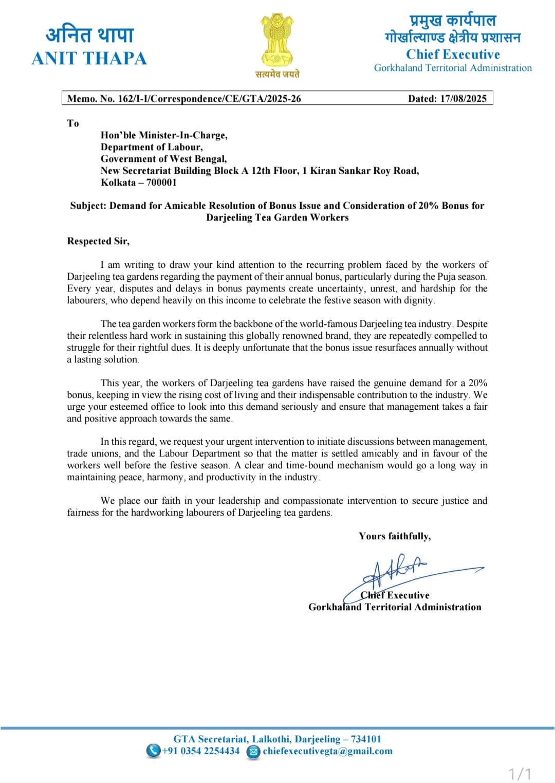 थापाले अघि भने, पश्चिम बङ्गाल सरकारको श्रम विभाग, दार्जीलिङ नर्थ रीजनल जोनबाट २२ अगस्ट २०२५ मा जारी गरिएको सल्लाह पत्र, आर्थिक वर्ष २०२४-२५ का लागि दार्जीलिङ, खरसाङ, कालिम्पोङ, तराई अनि डुवर्स क्षेत्रका चिया बगानका श्रमिकहरूलाई २०% बोनस दिने निर्णय गरिएको छ। जसको तलब बोनस पाउने सीमा नाघेको छ, ती कर्मचारीहरूलाई बोनस दिइँदैन; तर केवल त्यो सीमा काटेको वर्षमा मात्रै बोनस दिइन्छ। बोनसको भुक्तानी १५ सेप्टेम्बर २०२५ भित्र गर्नुपर्नेछ।