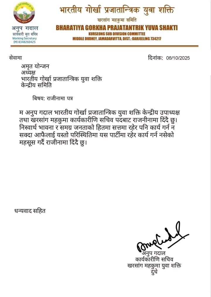 खरसाङ: भारतीय गोर्खा प्रजातान्त्रिक मोर्चा युवा शक्ति केन्द्रीय उपाध्यक्ष एवं खरसाङ महकुमाको कार्यकारी सचिव अनुप गदालले पद अनि पार्टीबाट राजीनामा दिएका छन्। उनले आफ्नो राजीनामा पत्र युवा शक्ति केन्द्रीय अध्यक्ष अमृत योञ्जनलाई सम्बोधन गरेर लेखेका छन्। उनले आफूले सत्य बोल्दा उनको बोलीलाई रोक्ने प्रयास गरिएको अनि अनित थापामा आफूले चाहेजस्तो नेता नपाएकोले राजीनामा दिएको जनाएका छन्। अनुप गदालले आफ्नोे राजीनामापछि एक भिडियो जारी गर्दै राजीनामाको कारण बताएका छन्। उनले एक भिडियो जारी गर्दै दुधे क्षेत्रमा भएको प्राकृतिक प्रकोपको समय सत्तामा रहेको पार्टीले केही गर्नु नसक्नु ठूलो बिडम्बना रहेको बताएका छन्। सत्तामा रहेर पनि केही गर्नु नसक्नु र युवाहरुको लागि नयाँ काम गर्न नसक्नु नै आफु यस पार्टीमा रहिरहनु पर्ने आवश्यकता नरहेको बताएका छन्।