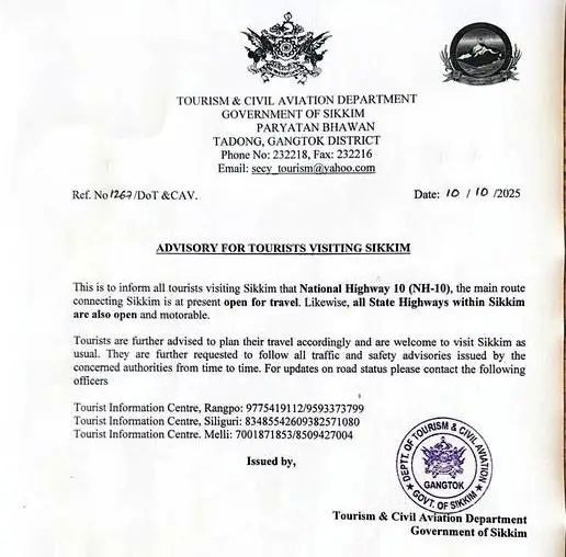 एड्भाइजरीमा सिक्किम घुम्न आउने सबै पर्यटकहरूलाई सिक्किमको राष्ट्रिय राजमार्ग १० अहिले खुला रहेको जानकारी गराएको छ। यसैगरी, सिक्किममा पनि सबै राज्य राजमार्गहरू खुला अनि वाहन चलाउन सकिने अवस्थामा रहेको बताएको छ। पर्यटकहरूलाई विभागद्वारा जारी गरिएको सुरक्षा र ट्राफिक एड्भाइजरीहरू पालन गर्न अनुरोध गरिएको छ।