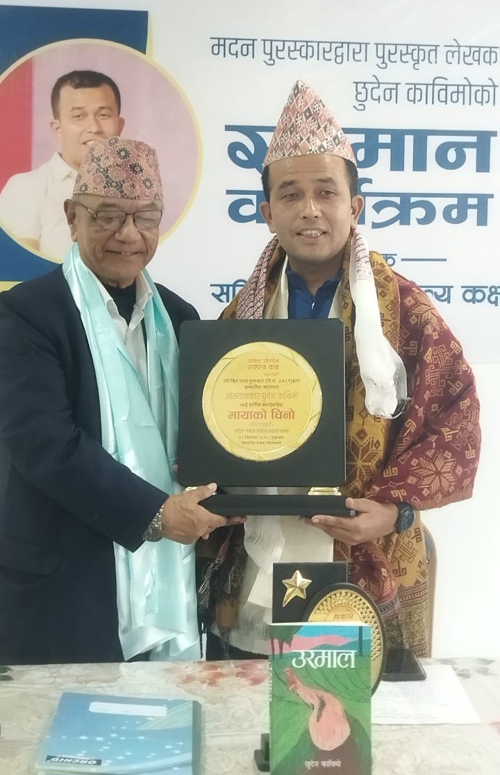 खरसाङ: मदन पुरस्कार २०२५ द्वारा पुरस्कृत लेखक छुदेन काबिमोलाई शुक्रबार एक कार्यक्रमबीच सविता गोम्देन साहित्य कक्षले सम्मान जनाएको छ। कवि मोहन ठकुरीको अध्यक्षतामा सम्पन्न भएको कार्यक्रममा कवि विचन्द्रले शल ओढाएर लेखक काबिमोलाई स्वागत जनाएका थिए भने कवि मोहन ठकुरीले स्मृति चिन्ह प्रदान गरेका थिए।