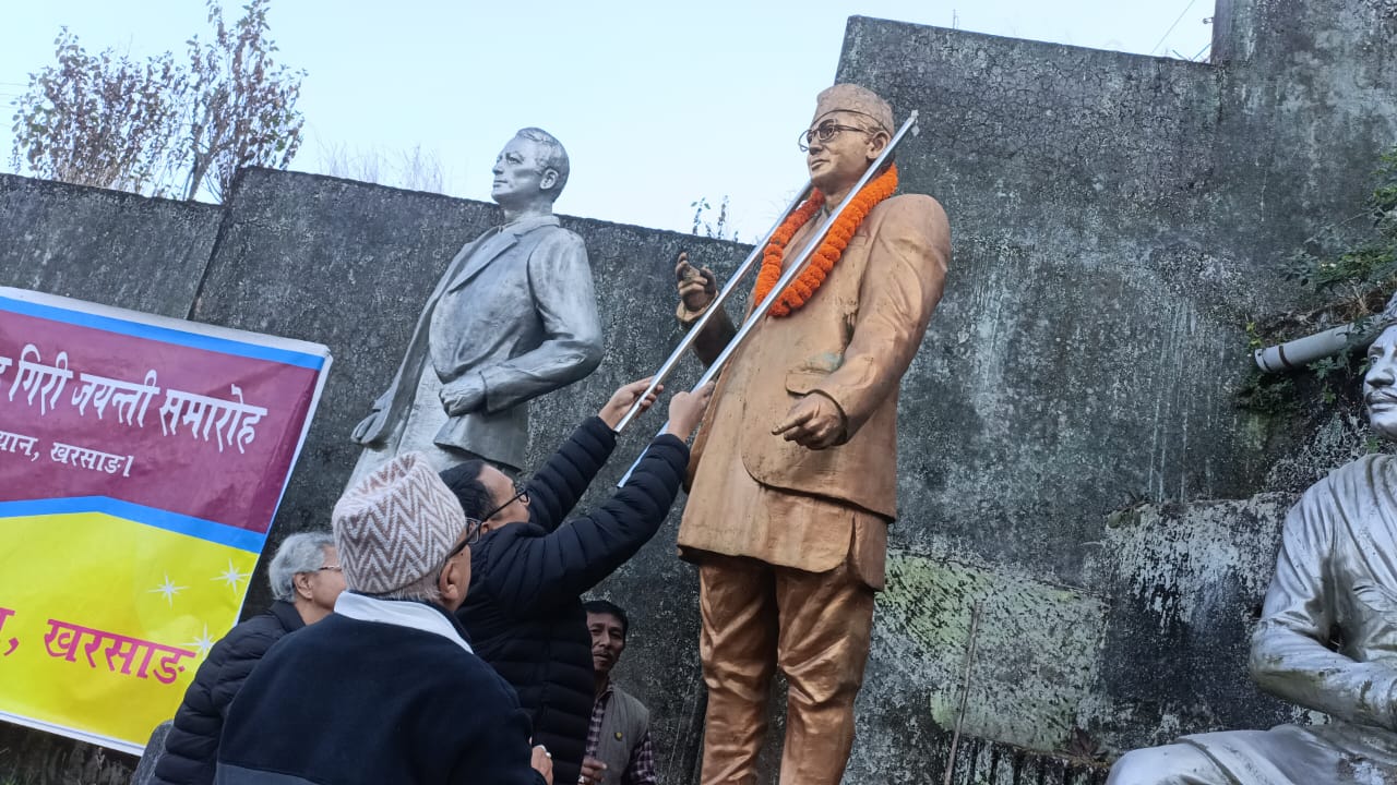 खरसाङ: गोर्खा जनपुस्तकालय खरसाङको आयोजनामा खरसाङमा गिरी जयन्ती समारोह सम्पन्न भएको छ। खरसाङको पंखाबारी रोडस्थित गोर्खा जातीय विभूति उद्यानमा रहेको जातीय कवि अगमसिंह गिरीको ९९औँ जन्मजयन्ती समारोह श्रध्दाञ्जली कार्यक्रमको रुपमा सम्पन्न भएको छ। उक्त कार्यक्रमको अध्यक्षता पुस्तकालयको उपाध्यक्ष कृष्ण पाण्डेले गरेका थिए भने प्रमुख अतिथिको रुपमा पुस्तकालयको पूर्व सभापति एवं वरिष्ठ समाजसेवी तिलक शर्मा उपस्थित रहेका थिए। कार्यक्रममा विशिष्ट अतिथिको रुपमा वरिष्ठ साहित्यकार, समाजसेवी तथा साहित्य अकादमी नेपाली भाषा परामर्श समितिकी सदस्या आशा मुखिया लामा उपस्थित रहेका थिए। पुस्तकालयको मूल सचिव विनोद रसाइलीले सञ्चालन गरेको कार्यक्रममा सभाध्यक्ष, प्रमुख अतिथि, विशिष्ट अतिथि लगायत अन्यहरुका बाहुलीबाट जातीय कवि अगमसिंह गिरीको सालिगमा धुप दीप प्रज्ज्वलन साथै माल्यार्पण गरेर श्रध्दाञ्जली अर्पण गरिएको छ। कार्यक्रममा प्रमुख अतिथि तिलक शर्माले गोर्खा जातीय विभूति उद्यानमा रहेको कवि गिरीको सालिग स्थापना विषयमा साथै शिलान्यास र अनावरण विषयमा बताए। कार्यक्रममा सभाध्यक्ष कृष्ण पाण्डेले कार्यक्रममा उपस्थित सबैलाई धन्यवाद दिएका छन्। यसपाली पुस्तकालयको आयोजनामा कवि गिरीको श्रध्दाञ्जली अर्पण कार्यक्रम मात्र आयोजना गरिएको र आगामी वर्ष कवि गिरीको शतवार्षिकी समारोह भव्य रुपमा आयोजना गरिने भएको छ।