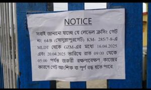 মালদহ: রেললাইনের সংস্কারের জন্য আচমকাই দুই দিন রাত থেকে ভোর পর্যন্ত লেবেল ক্রসিং বন্ধ রাখার নোটিশ পড়তেই অস্বস্তিতে পড়েছে সাধারণ মানুষ। ইংরেজবাজার ব্লকের সাদুল্লাপুর মহাশ্মশান যাওয়ার