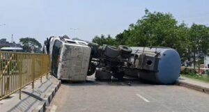 আজ রবিবার সকালে বর্ধমান শহরের তেজগঞ্জ এলাকায় ১৯ নম্বর জাতীয় সড়কের ধারে সার্ভিস রোডে একটি সিমেন্টের কেমিক্যাল বোঝাই ট্যাঙ্কার নিয়ন্ত্রণ হারিয়ে উল্টে যায়। তবে, সকালবেলা পথচারীদের