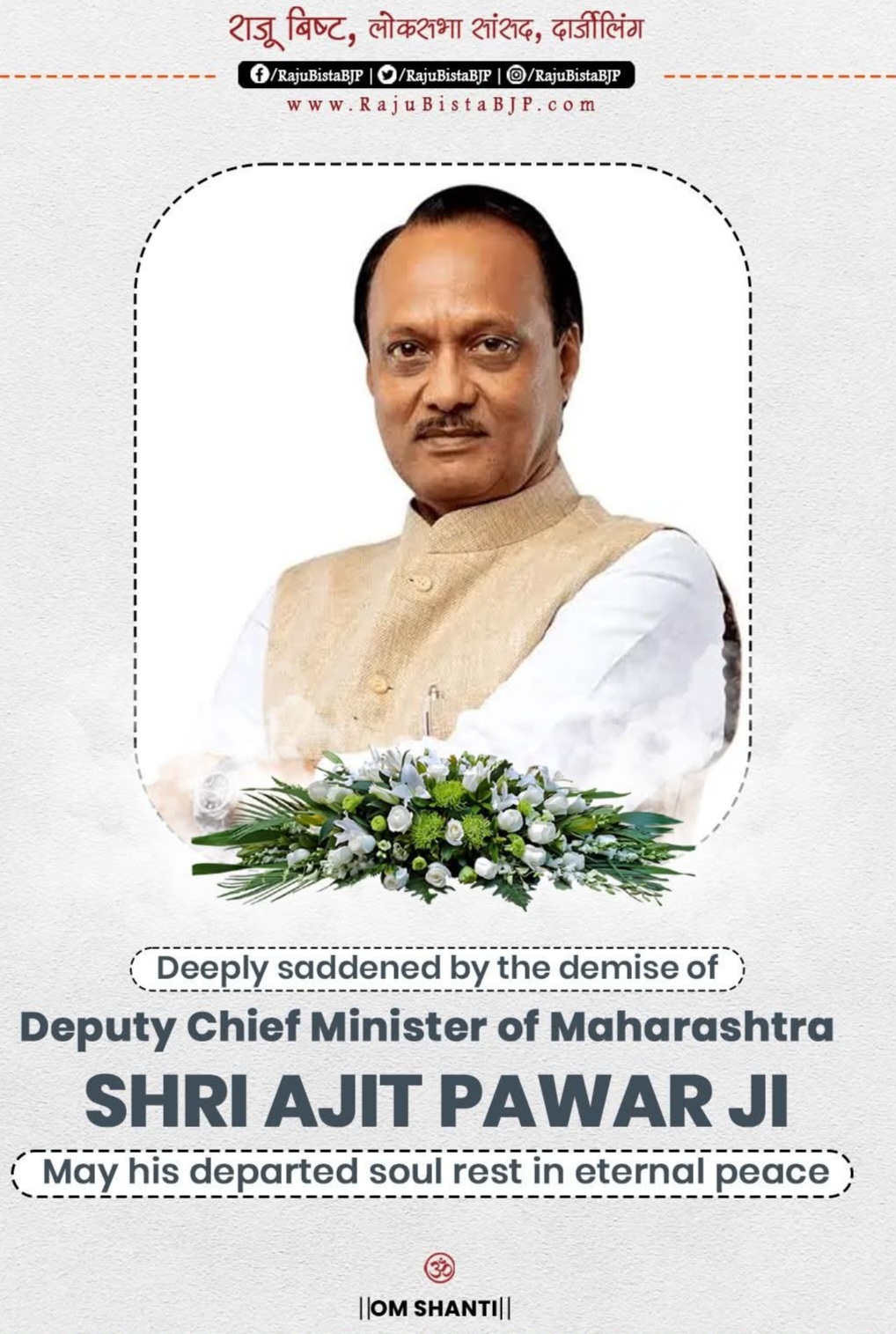 दार्जिलिंग: दार्जिलिंग लोकसभा सांसद राजु बिष्ट ने आज सोशल मीडिया के माध्यम से महाराष्ट्र के उपमुख्यमंत्री अजीत पवार के निधन के समाचार पर गहरा दुख व्यक्त